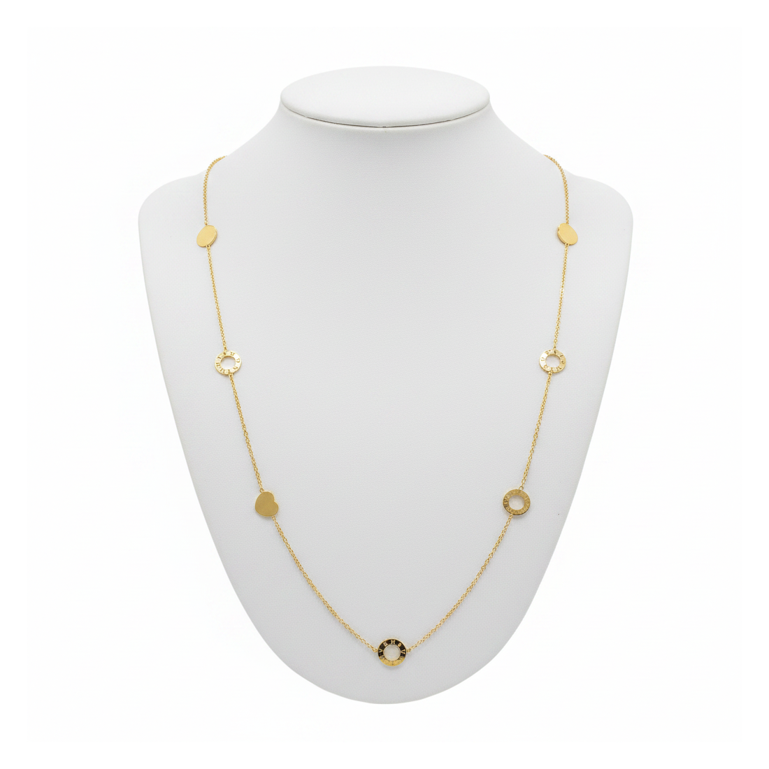 Objevte kouzlo dlouhého náhrdelníku "Zlatá Aura", který okouzlí minimalistickým designem a jemným leskem. Jemný, pozlacený řetízek zdobí pravidelně rozmístěné geometrické prvky – hladké kruhy, srdíčka a otevřené kroužky. Tento elegantní doplněk dokonale podtrhne jak každodenní, tak večerní outfity a dodá jim nádech moderního půvabu. Ideální pro samostatné nošení nebo jako základ pro vrstvené kompozice.