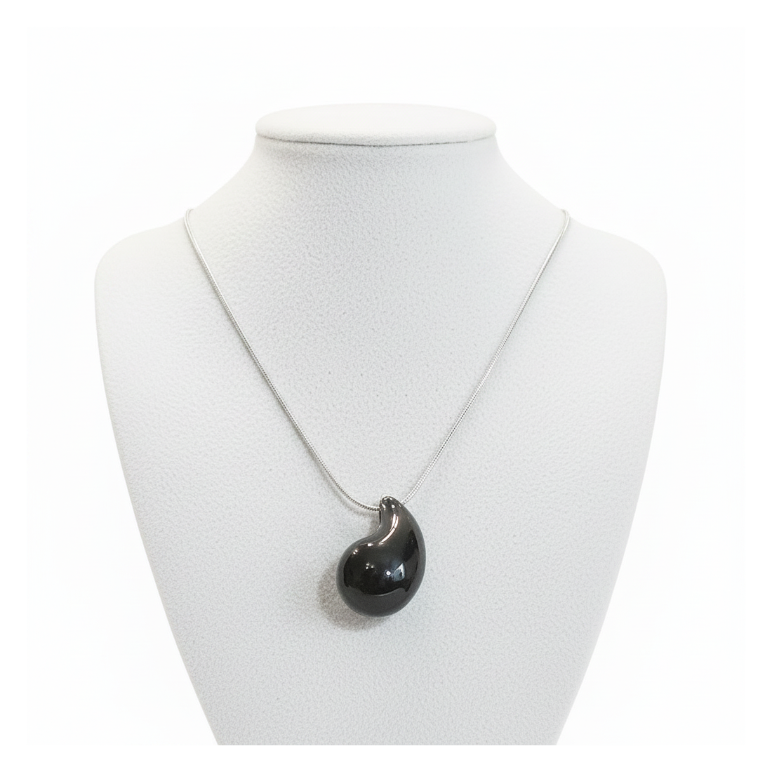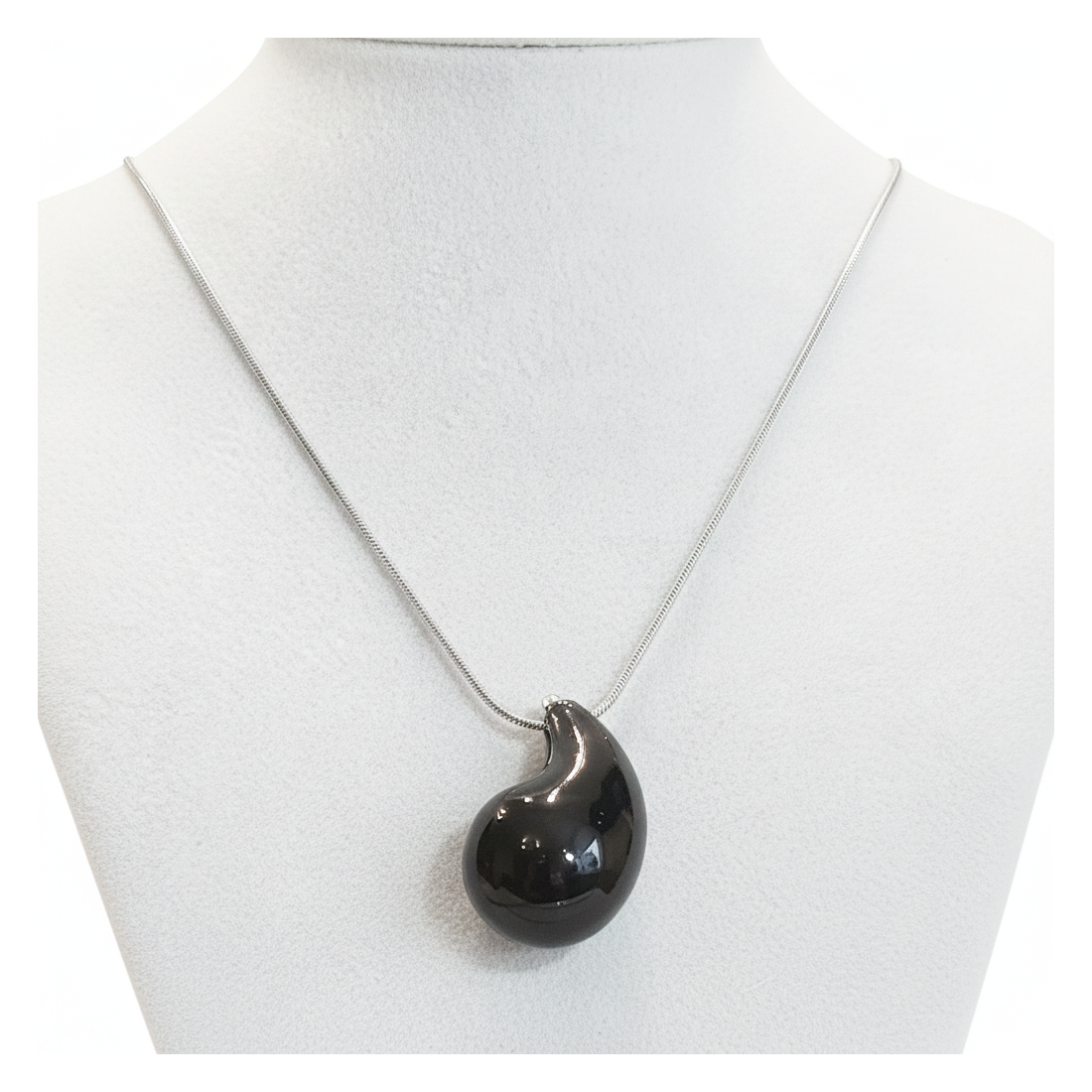 Tento jedinečný náhrdelník je ztělesněním moderní elegance. Jeho hlavním prvkem je hladký, lesklý přívěsek ve tvaru kapky, vyrobený z tmavého, leštěného materiálu, který krásně odráží světlo. Celý šperk je zavěšen na jemném, stříbrném řetízku typu had, což mu dodává jemnost. Ideální pro každodenní nošení i pro speciální příležitosti, skvěle doplní jak ležérní, tak sofistikovanější styly.