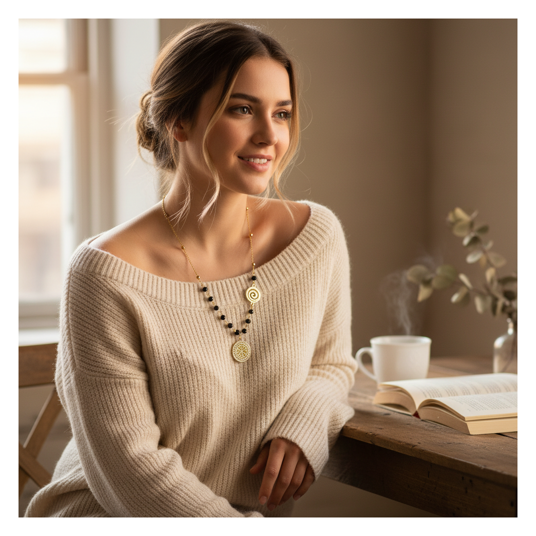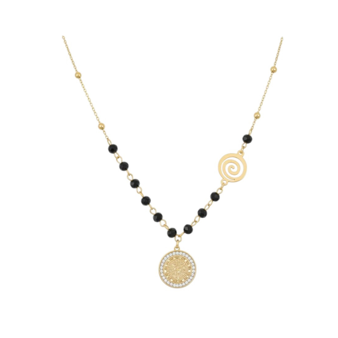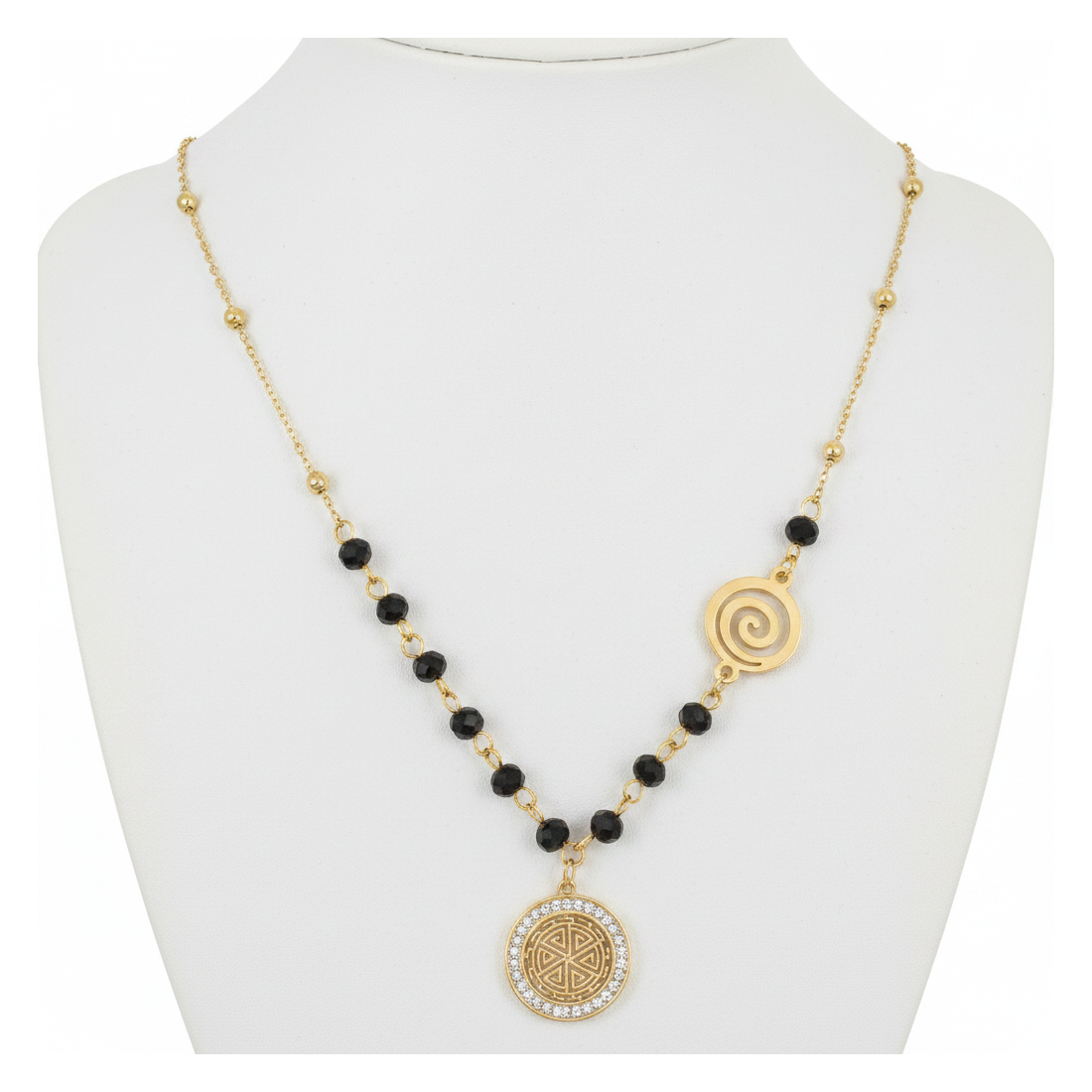Elegantní náhrdelník, který spojuje klasický půvab zlata s tajemstvím černých korálků. Dva unikátní přívěsky – spirálový a kulatý se složitým vzorem – mu dodávají osobitý charakter. Ideální pro každodenní nošení i speciální příležitosti, dokonale doplní boho, ležérní nebo glamour outfity. Zdůrazněte svůj individuální styl a dodejte jiskru každému outfitu.