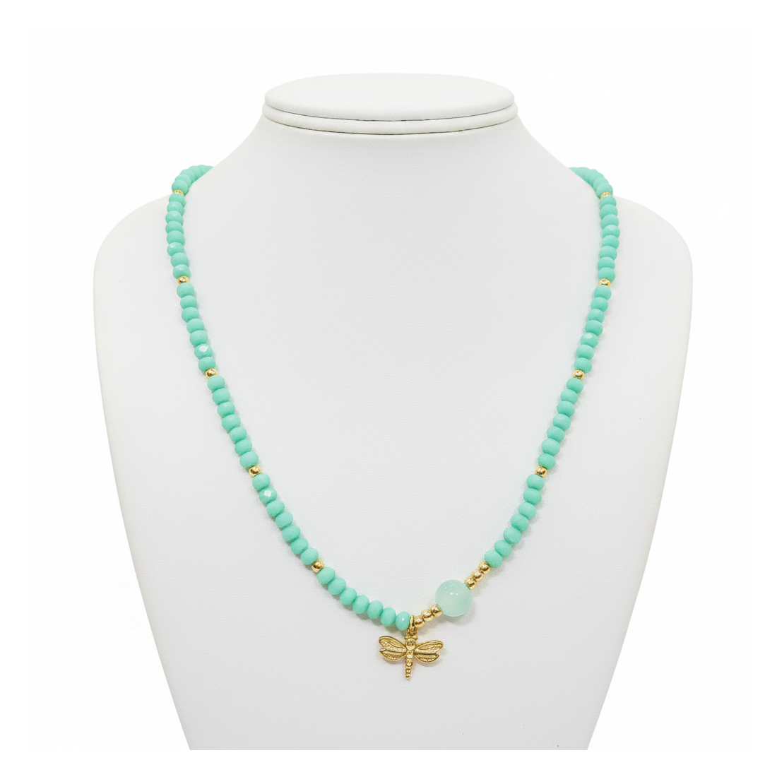 Objevte kouzlo léta s naším náhrdelníkem Vážka, který okouzlí svěžím mátovým odstínem. Jemné korálky, propletené zlatými akcenty, tvoří harmonický celek. Centrálním bodem je půvabný přívěsek ve tvaru vážky, symbolizující lehkost a svobodu. Tento náhrdelník je ideálním doplňkem k letním šatům a ležérním stylizacím, dodávající jim jemný lesk.