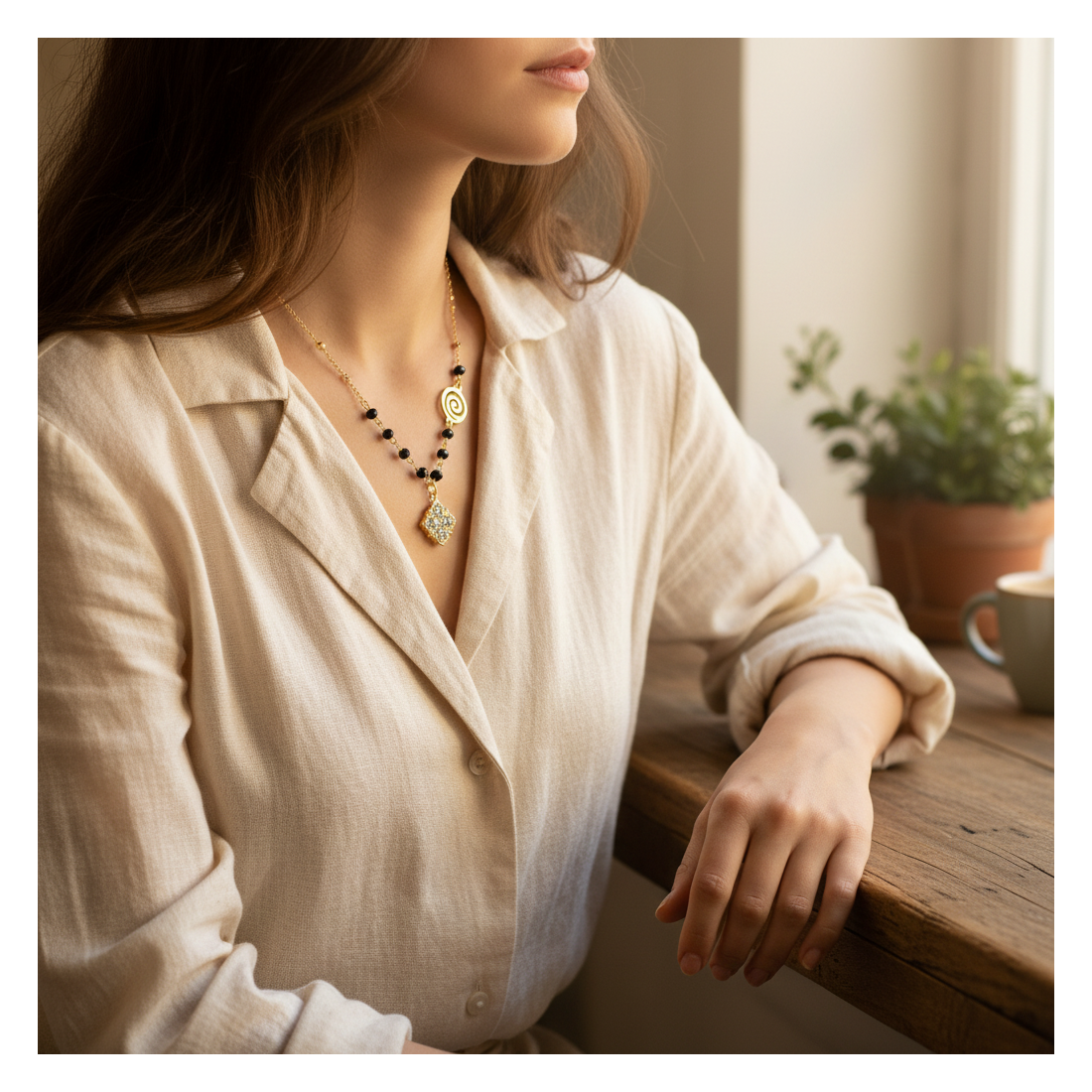 Objevte jiskru s náhrdelníkem Aura, který kombinuje klasickou eleganci s moderním nádechem. Zlatý řetízek s jemnými kuličkami se proplétá s fasetovanými černými korálky a vytváří okouzlující kompozici. Centrální přívěsek ve tvaru čtyřlístku, zdobený třpytivými zirkony, upoutá pozornost a dodává šmrnc. Ideální pro speciální příležitosti i pro každodenní stylizace, když se chcete cítit výjimečně.