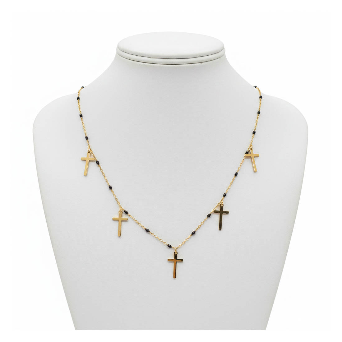Objevte kouzlo náhrdelníku Cindy, který spojuje jemnost s moderním stylem. Jemný, pozlacený řetízek je zdoben drobnými černými korálky a pěti půvabnými přívěsky ve tvaru křížků. Tento elegantní doplněk dokonale podtrhne vaši individualitu a hodí se jak k ležérním outfitům, tak k sofistikovanějším kreacím. Ideální jako dárek nebo jako vyjádření osobního stylu.