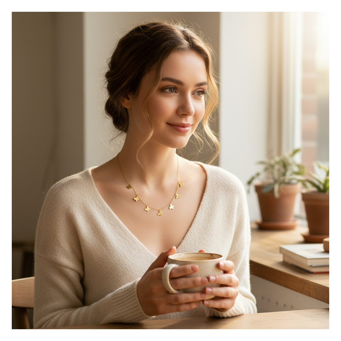 Objevte kouzlo jemnosti s naším náhrdelníkem Motýlci, který dodá lehkost každému outfitu. Tento okouzlující zlatý doplněk, zdobený řadou subtilních motýlků, krásně zvýrazní dekolt. Ideální pro každodenní nošení, do práce nebo na romantické rande, přinese dotek svěžesti a dívčího půvabu. Vyrobeno s důrazem na detail, stane se vaším oblíbeným akcentem.