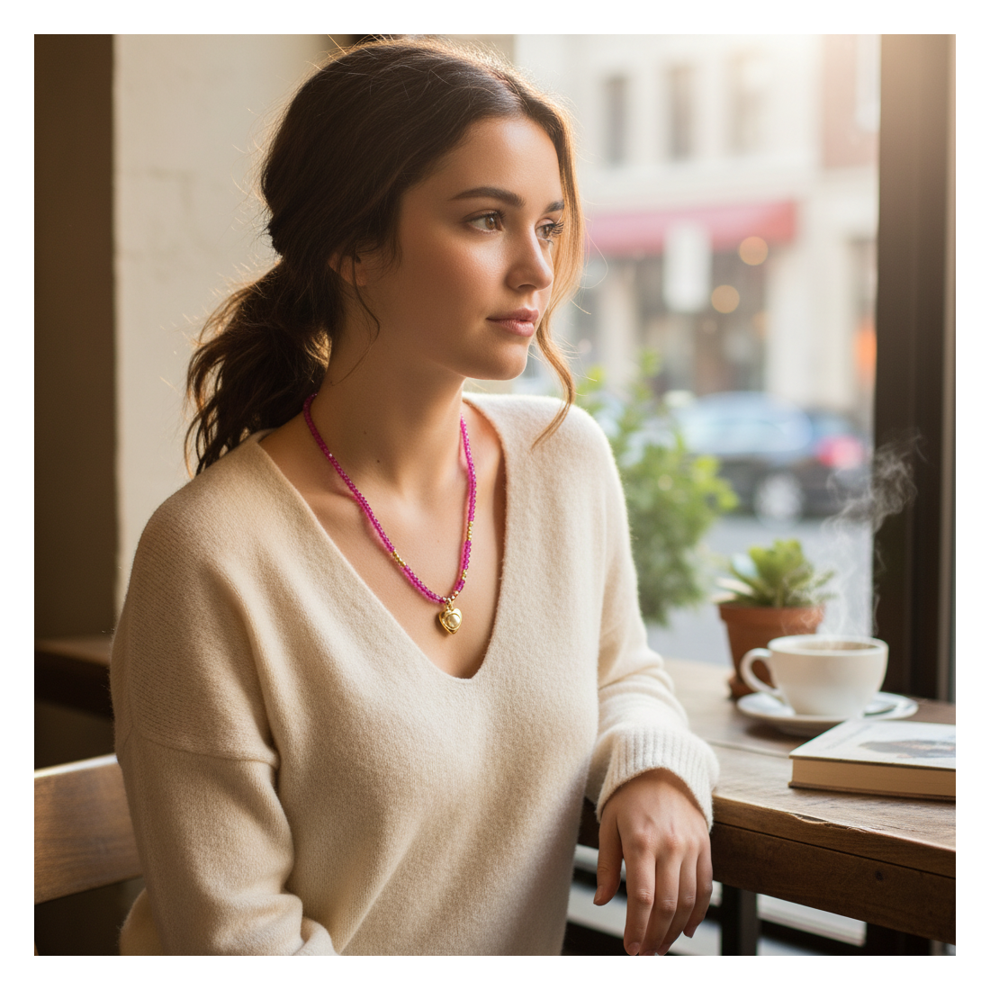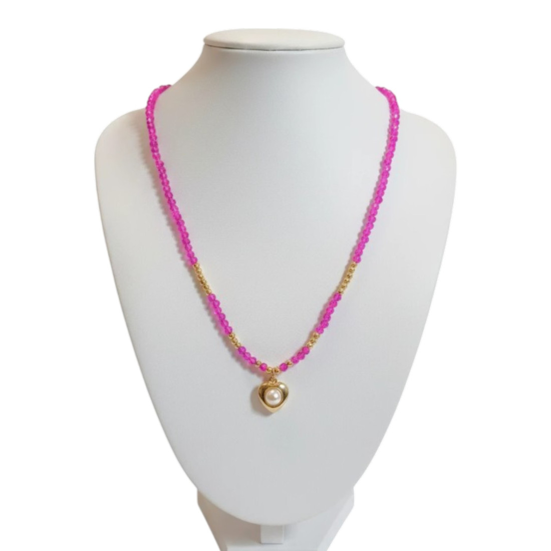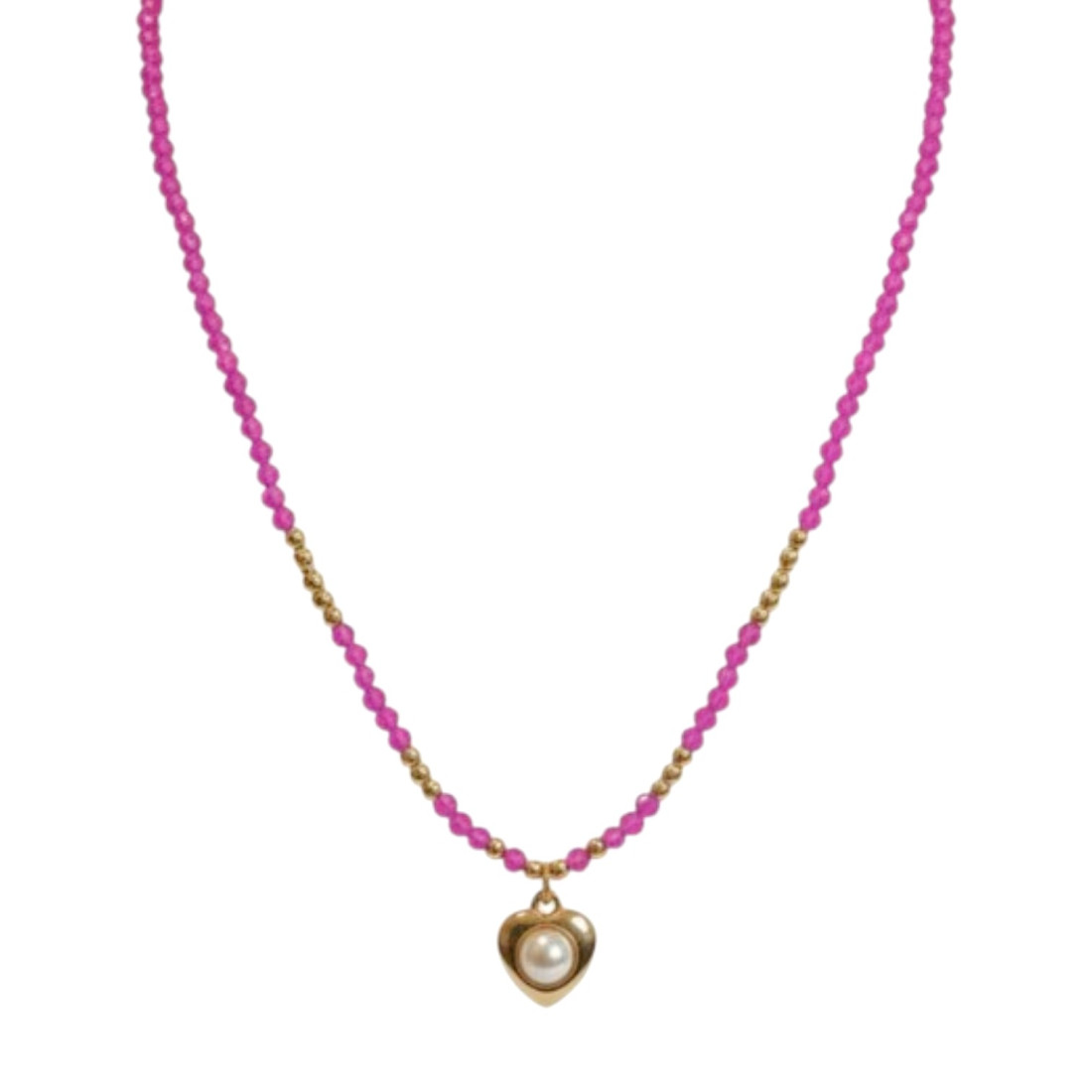 Tento okouzlující náhrdelník je ztělesněním jemnosti a ženského stylu. Skládá se z drobných, fuchsiových korálků propletených zlatými akcenty, které vedou k roztomilému přívěsku ve tvaru srdce. Nádherně zvýrazní dekolt a dodá jiskru jak ležérním, tak sofistikovanějším outfitům. Ideální na setkání s přáteli, rande nebo jako decentní doplněk k pracovnímu vzhledu.