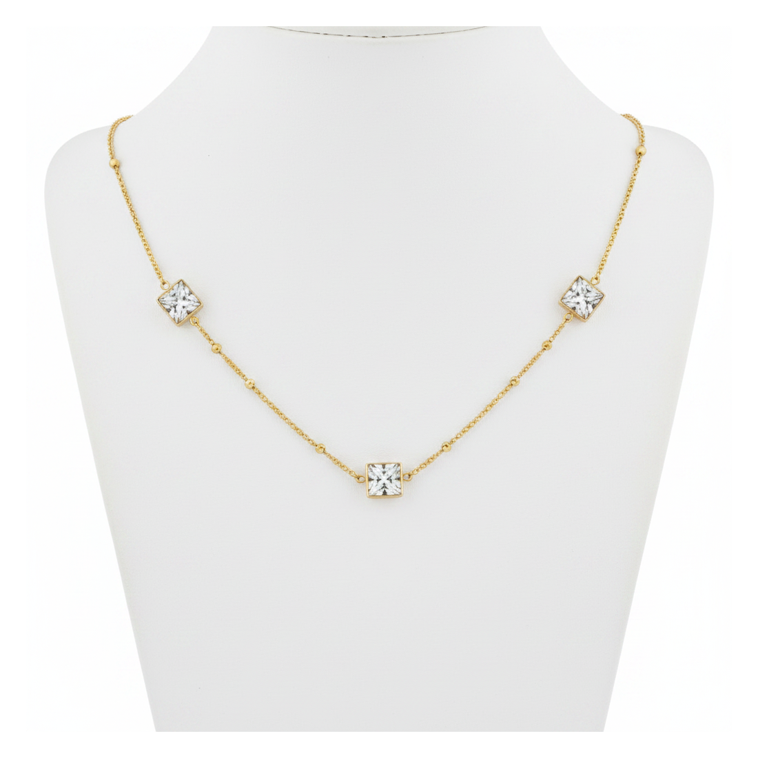 Objevte náhrdelník Čtvercový Lesk, který okouzlí jemnou kombinací zlatého odstínu a zářivých zirkonů. Jemný řetízek je zdoben třemi čtvercovými prvky, které krásně odrážejí světlo. Tento elegantní doplněk se skvěle hodí jak pro každodenní nošení, tak pro speciální příležitosti, dodávající šmrnc a lesk. Ideální pro ženy, které oceňují minimalistický design s nádechem glamour.