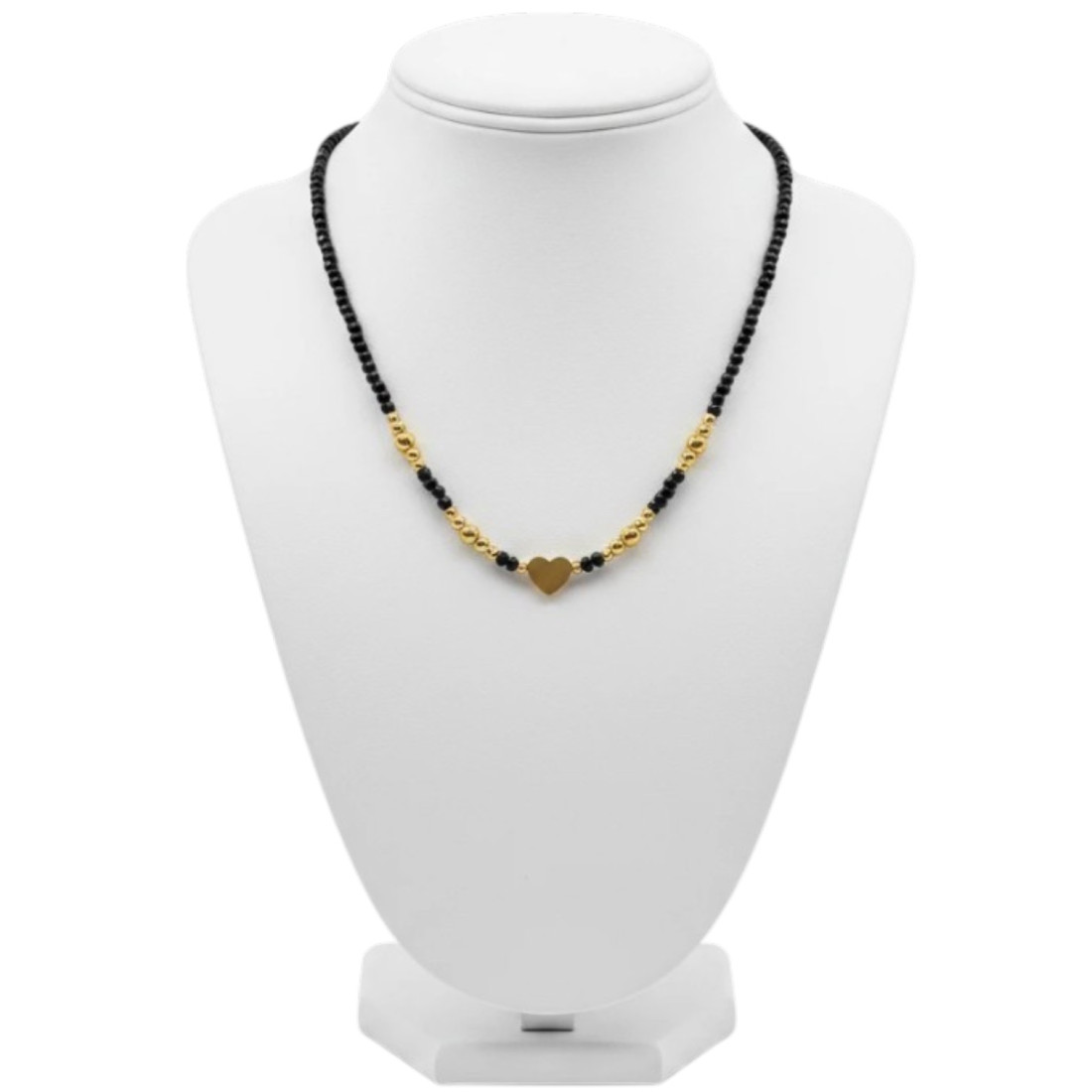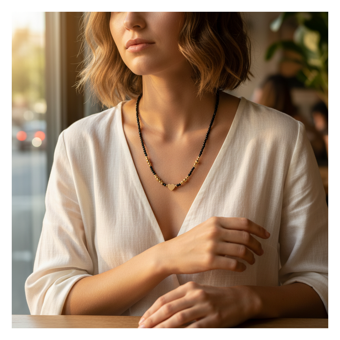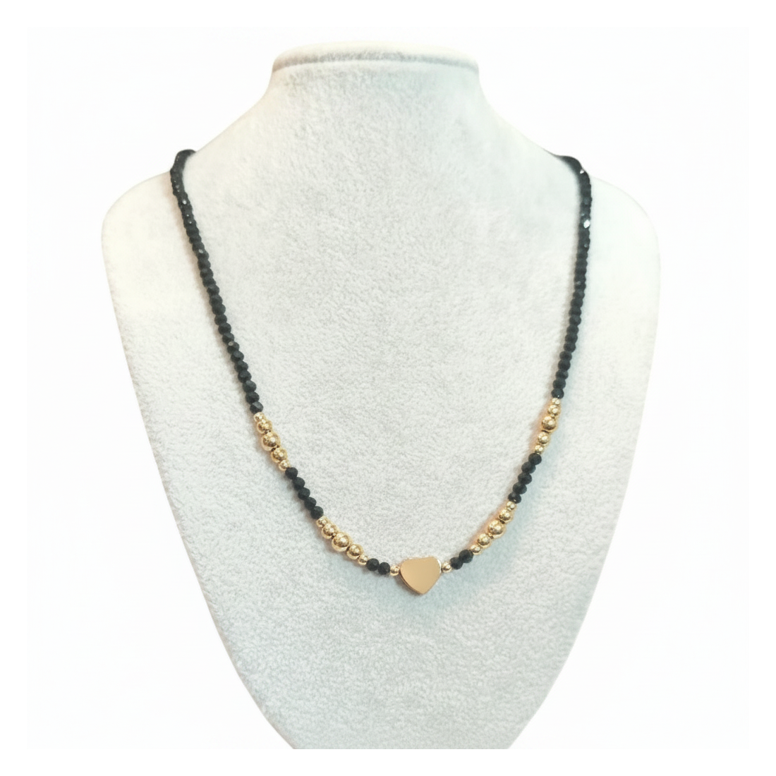 Objevte kouzlo náhrdelníku Srdce Glamour, který okouzlí kombinací klasické černé a třpytivého zlata. Jemné, fasetované korálky krásně odrážejí světlo a vytvářejí jemný lesk. Centrálním bodem je okouzlující zlaté srdíčko, které šperku dodává romantický nádech. Tento elegantní doplněk se skvěle hodí jak pro každodenní nošení, tak pro speciální příležitosti a podtrhne váš jedinečný styl.