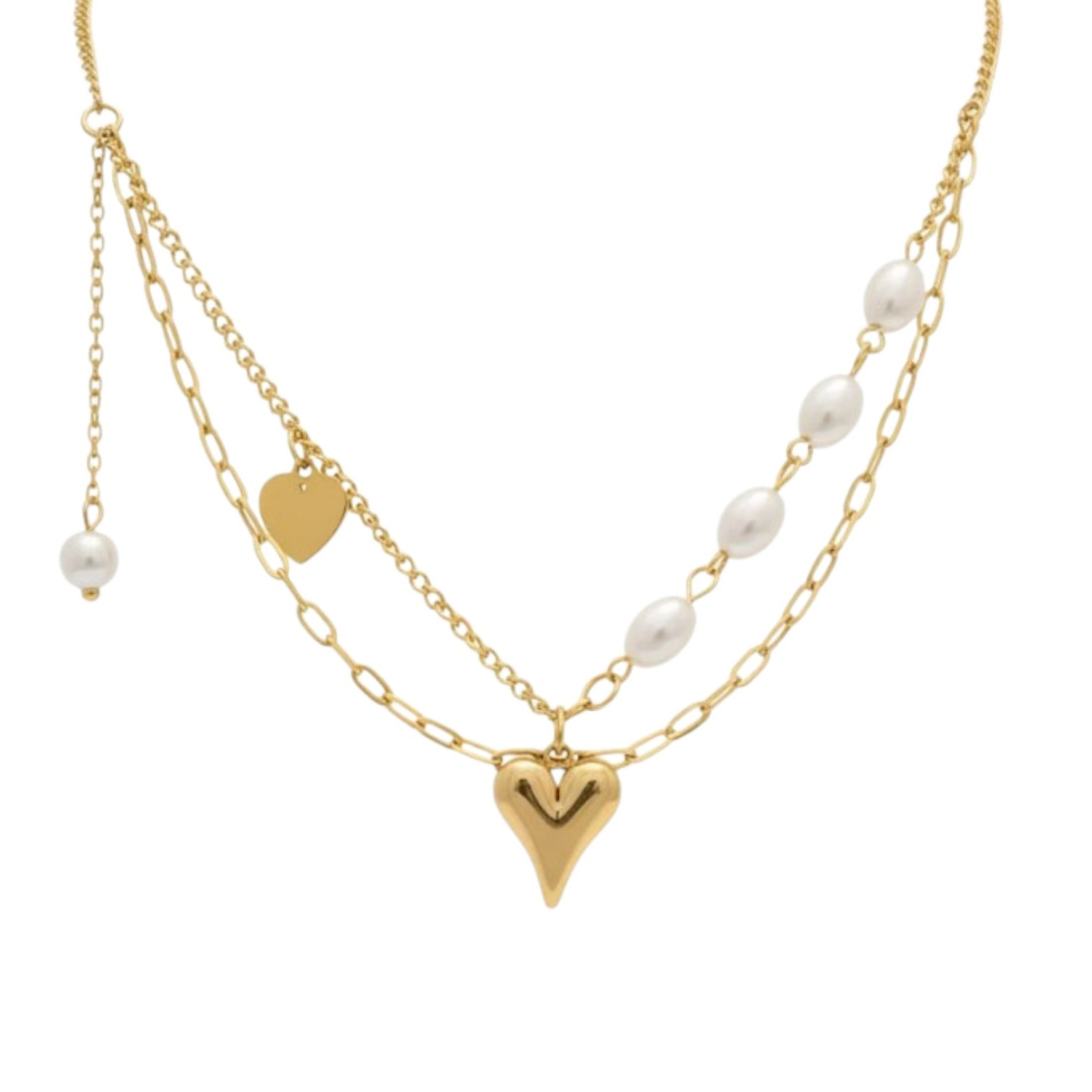 Objevte kouzlo vrstveného náhrdelníku, který kombinuje klasické perly s moderním designem. Zlaté řetízky, jemné sladkovodní perly a okouzlující přívěsek ve tvaru srdce tvoří harmonický celek. Tento náhrdelník dokonale podtrhne váš styl a dodá jiskru jak každodenním, tak večerním outfitům. Ideální volba pro ženy, které oceňují eleganci a jemný půvab. Noste ho samostatně nebo v kombinaci s dalšími oblíbenými doplňky.