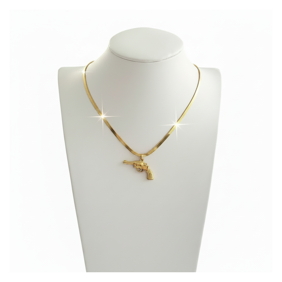 Tento jedinečný náhrdelník je ztělesněním odvážného stylu. Pozlacený hadí řetízek se dokonale snoubí s fascinujícím přívěskem ve tvaru revolveru. Je to ideální doplněk pro ženy, které rády vyjadřují svou individualitu a nebojí se vystoupit z davu. Skvěle se hodí pro každodenní nošení i na večerní akce, dodá šmrnc a originalitu. Podtrhněte svůj charakter tímto neobyčejným akcentem.