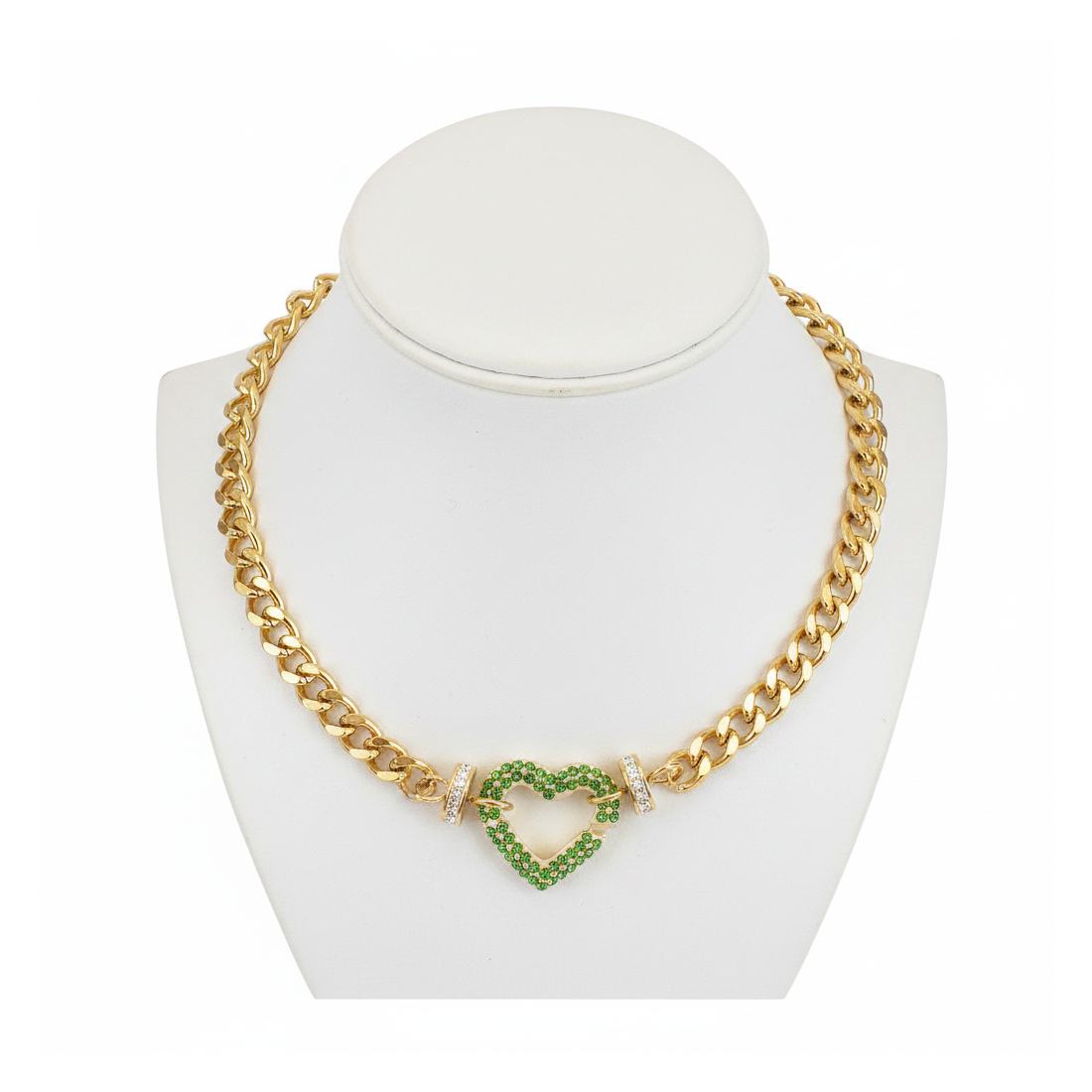 Objevte kouzlo náramku Cindy, který okouzlí svým zlatým leskem a jemným srdíčkem. Vyroben z chirurgické oceli, zaručuje odolnost a pohodlí při nošení, zatímco pozlacený povrch mu dodává luxusní charakter. Centrálním prvkem je roztomilé srdce, složitě osázené třpytivými zelenými zirkony, které přitahují pozornost a dodávají energii. Drobné, bílé zirkony na spojovacích článcích jemně podtrhují jeho krásu. Ideální na rande, setkání s přáteli nebo jako elegantní doplněk k večernímu outfitu, tento náramek je ztělesněním ženskosti a glamour stylu.