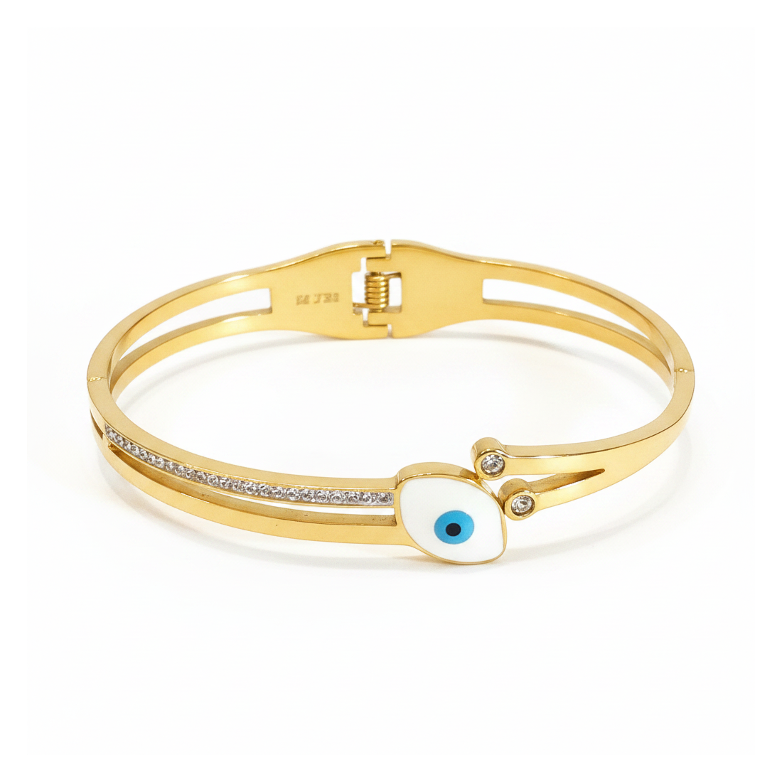 Objevte kouzlo zlatého náramku, který spojuje eleganci a symboliku. Vyrobený z pozlacené slitiny kovů, je zdobený lesklými zirkony a centrálním, módním okem proroka, které chrání před zlým pohledem. Tento stylový šperk dokonale doplní jakýkoli outfit a dodá mu lesk a nádech tajemství. Ideální jako dárek nebo jedinečný doplněk do vaší sbírky.