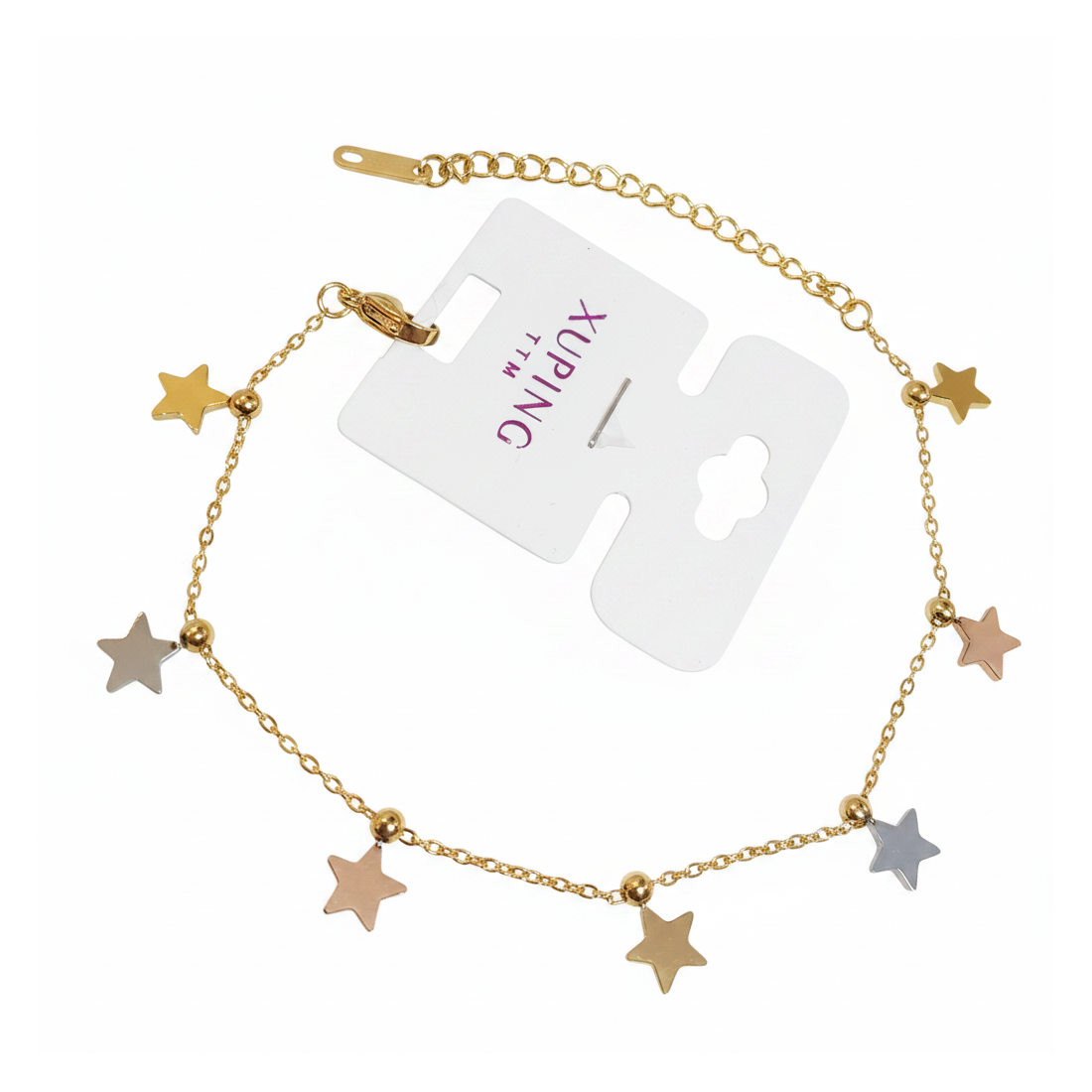 Objevte kouzelné kouzlo náramku Stella, který rozzáří každý váš styling. Jemný, pozlacený řetízek zdobí roztomilé hvězdičky v odstínech zlata, růžového zlata a stříbra, čímž vytváří harmonickou a moderní kompozici. Tento krásný šperk se skvěle hodí jako doplněk k denním outfitům i jako decentní akcent pro večerní vycházky. Vyrobený s důrazem na detail, bude krásným doplňkem vaší sbírky, dodávající lesk a dívčí půvab.