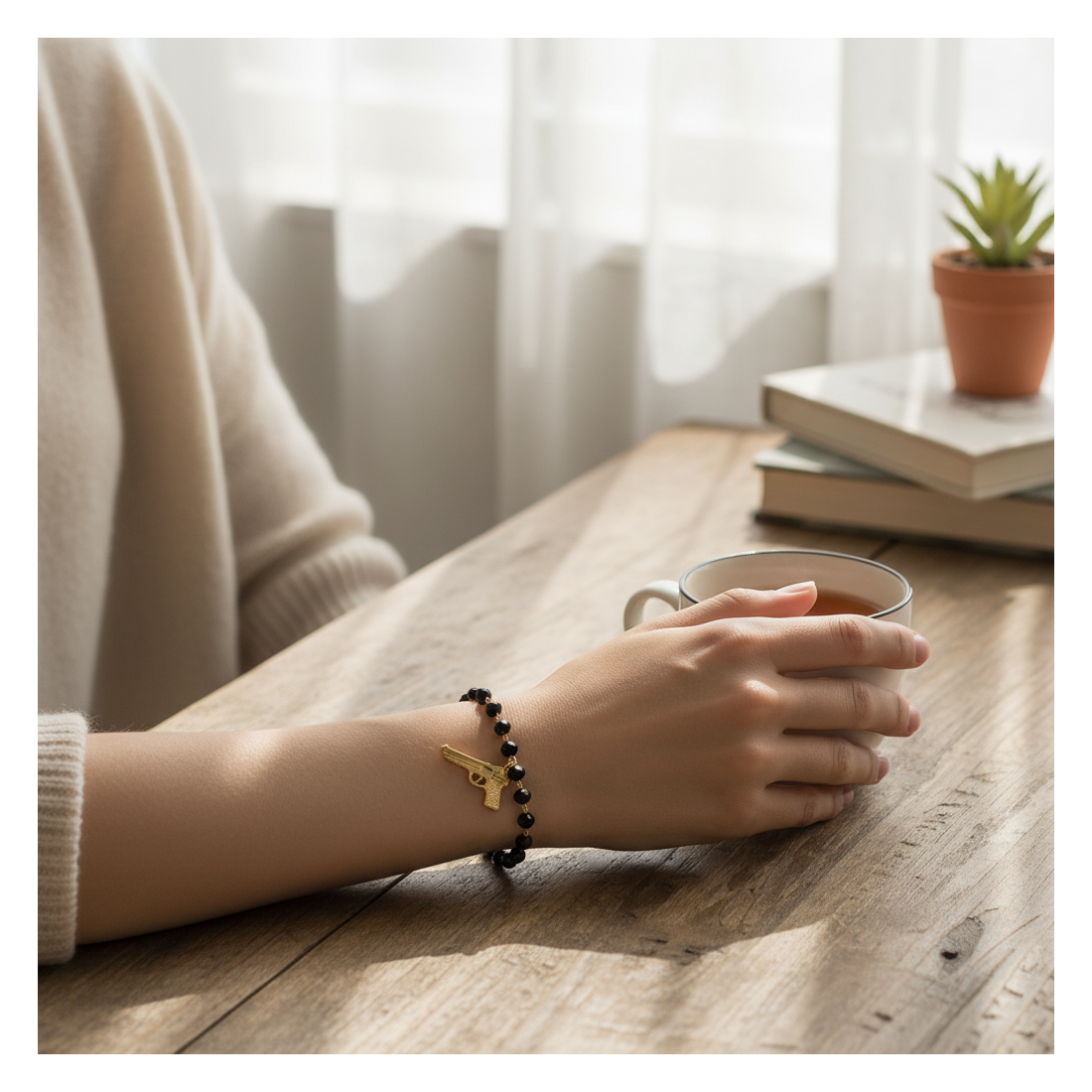 Podtrhněte svůj jedinečný styl s náramkem "Pistole", který kombinuje klasické černé korálky s výrazným zlatým přívěskem ve tvaru pistole. Tento neobyčejný doplněk je ideální volbou pro ženy, které si cení originality a chtějí svým outfitům dodat šmrnc. Skvěle se hodí jak pro každodenní nošení, tak pro večerní akce, přitahuje pozornost a zdůrazňuje vaši osobnost. Vyrobeno s důrazem na detail, zajistí pohodlné nošení a bude módním akcentem.