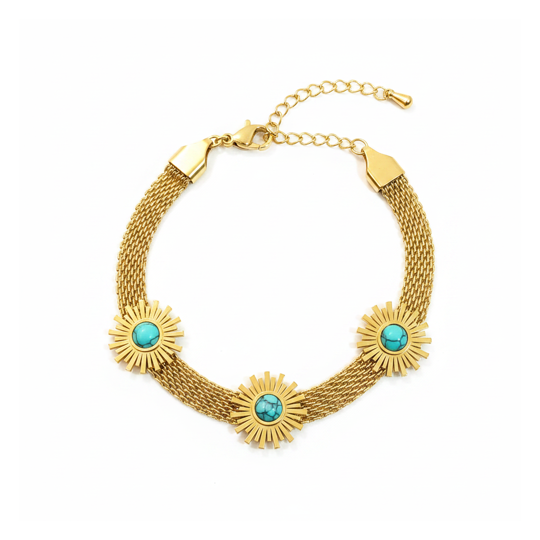 Tento okouzlující náramek je ztělesněním letního lesku a elegance. Vyrobený z chirurgické oceli ve zlaté barvě, zaujme třemi ozdobnými prvky ve tvaru slunce, s centrálně umístěnými tyrkysovými kameny. Jeho síťovaná struktura dodává lehkost a sofistikovanost, zatímco nastavitelné zapínání zajišťuje perfektní padnutí. Vynikající pro každodenní styling i pro speciální příležitosti, podtrhující váš jedinečný styl.