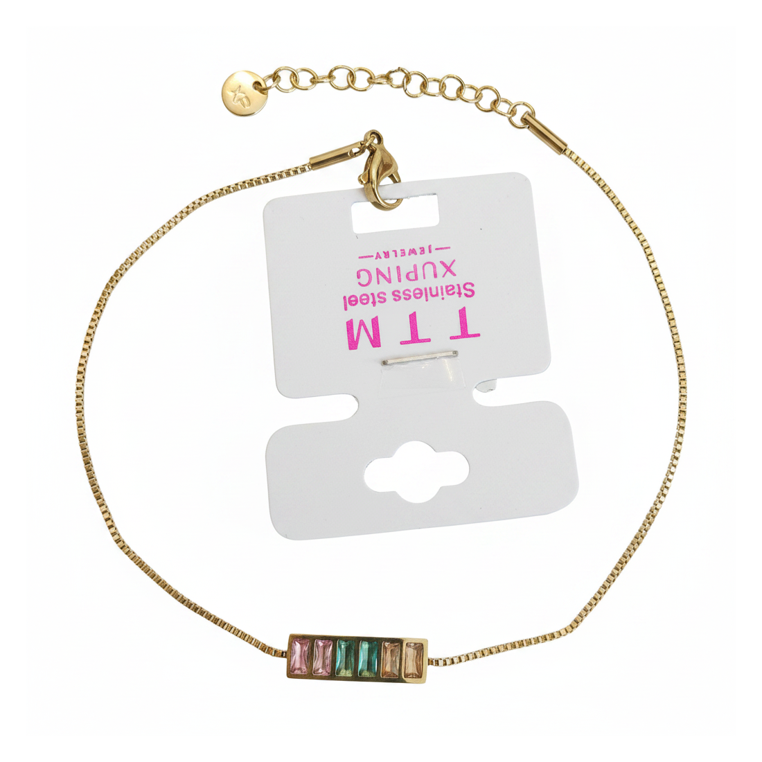 Tento okouzlující náramek z chirurgické oceli je ztělesněním moderní elegance. Zlacený řetízkový náramek typu box chain je zdoben obdélníkovým přívěskem s řadou třpytivých, barevných zirkonů v odstínech růžové, zelené a jantarové. Nastavitelné zapínání zajišťuje dokonalé přizpůsobení každému zápěstí. Je to ideální doplněk, který dodá jiskru jak každodenním, tak večerním outfitům a podtrhne váš individuální styl.