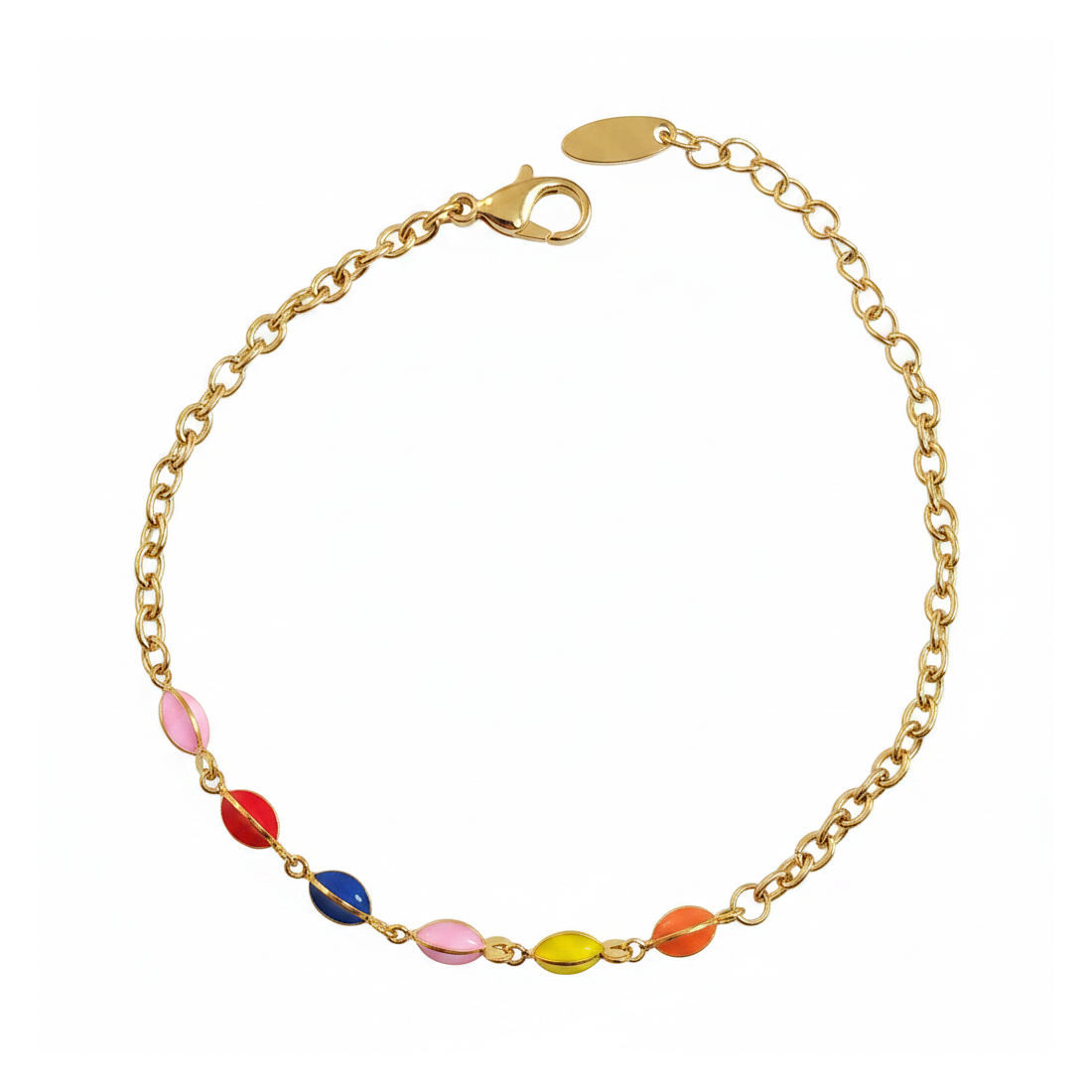 Entdecken Sie den Charme des Armbands Carmen, das jedes Outfit aufhellt. Eine zarte vergoldete Kette ist mit lebhaften, kornförmigen Emaille-Elementen verziert, die ihm einen einzigartigen Charakter verleihen. Es ist das ideale Accessoire für den Sommer, Festivals oder als fröhlicher Akzent für Ihr tägliches Outfit. Hergestellt aus vergoldeter Legierung, gewährleistet es Langlebigkeit und einen schönen Glanz. Betonen Sie Ihre Individualität mit diesem bezaubernden Armband.