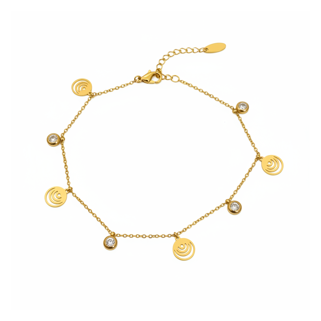 Entdecken Sie den Charme des Cindy Armbands, das jedem Outfit Glanz verleiht. Gefertigt aus robustem goldfarbenem Edelstahl, ist es anlaufbeständig und hypoallergen. Die zarte Kette ist mit funkelnden Zirkonia und filigranen, durchbrochenen Kreisanhängern verziert. Ideal für den Alltag, die Arbeit, ein Date oder einen Abend, um Ihren Stil dezent zu unterstreichen.