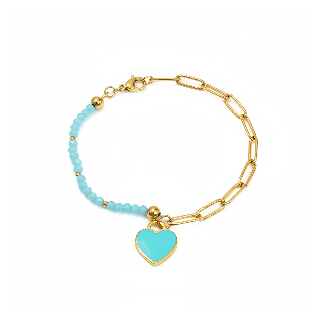 Entdecken Sie den Charme dieses Armbands, das modernes Design mit einem Hauch von Romantik verbindet. Die goldfarbene Kette mit einzigartigem Gliedermuster harmoniert perfekt mit den zarten, hellblauen Perlen und bildet ein stimmiges Gesamtbild. Der Mittelpunkt ist ein bezaubernder herzförmiger Anhänger, verziert mit türkisfarbener Emaille, der Blicke auf sich zieht und jedem Outfit Frische verleiht. Ob einzeln oder im Set mit anderem Schmuck getragen, dieses Armband ist eine perfekte Wahl für jeden Anlass, von lässigen Treffen bis hin zu eleganten Veranstaltungen. Betonen Sie Ihren Stil und verleihen Sie Ihrem Look einen Farbtupfer.