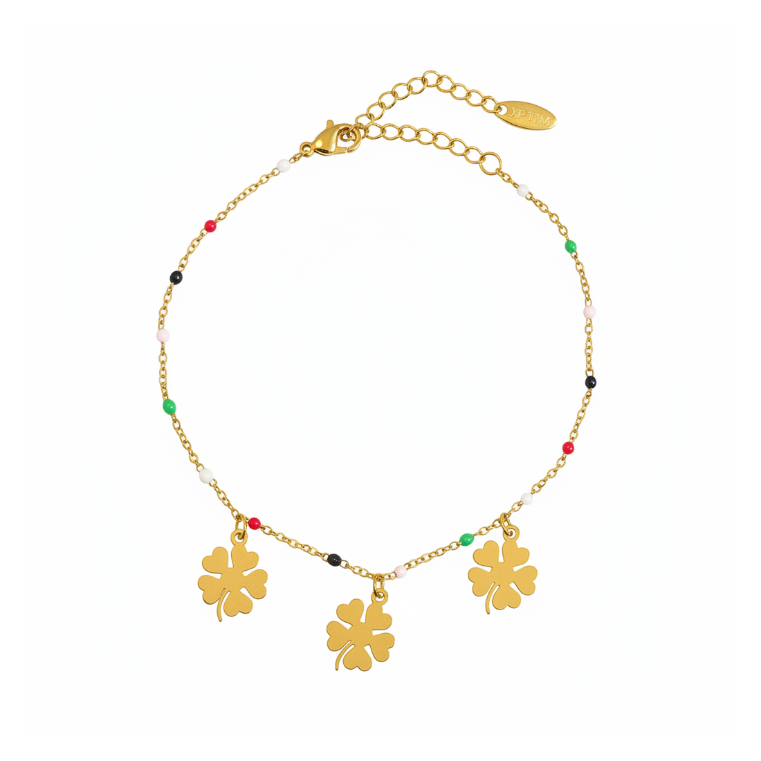 Entdecken Sie Charme und Glück mit unserem Glücksklee Armband. Eine zarte vergoldete Kette ist mit drei entzückenden vierblättrigen Kleeblatt-Anhängern verziert, die Glück symbolisieren. Dezente, bunte Perlen ergänzen das Design und verleihen dem Schmuckstück Leichtigkeit und einen modernen Charakter. Perfekt für den Alltag oder besondere Anlässe, wird es Ihren individuellen Stil wunderschön unterstreichen. Dies ist ein ideales Accessoire, um Ihrer Sammlung etwas Glanz und positive Energie zu verleihen.