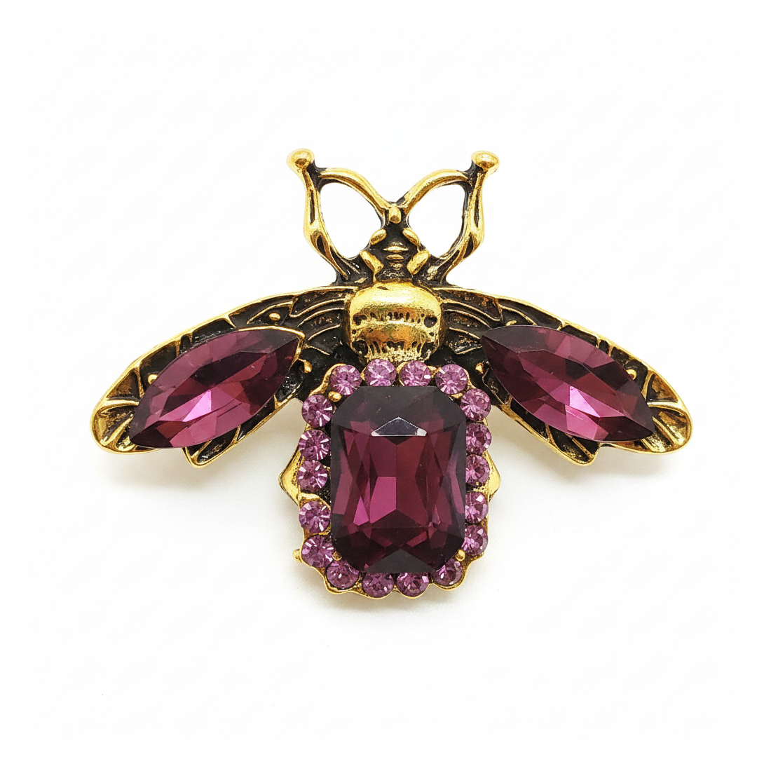 Entdecken Sie diese außergewöhnliche Insektenbrosche, die jedem Outfit Glanz verleiht. Ihre goldene Fassung kontrastiert wunderschön mit den tiefen, burgunderroten Kristallen, die Flügel und Körper schmücken. Winzige violette Strasssteine, die den Hauptstein umgeben, verleihen ihr einen raffinierten Charakter und ein luxuriöses Finish. Diese Brosche ist ein perfektes Accessoire für elegante Kleider, Blazer oder Mäntel und verleiht Ihrem Outfit einen Hauch von Glamour und Vintage-Flair. Betonen Sie Ihren individuellen Stil und ziehen Sie mit diesem einzigartigen Schmuckstück Blicke auf sich.