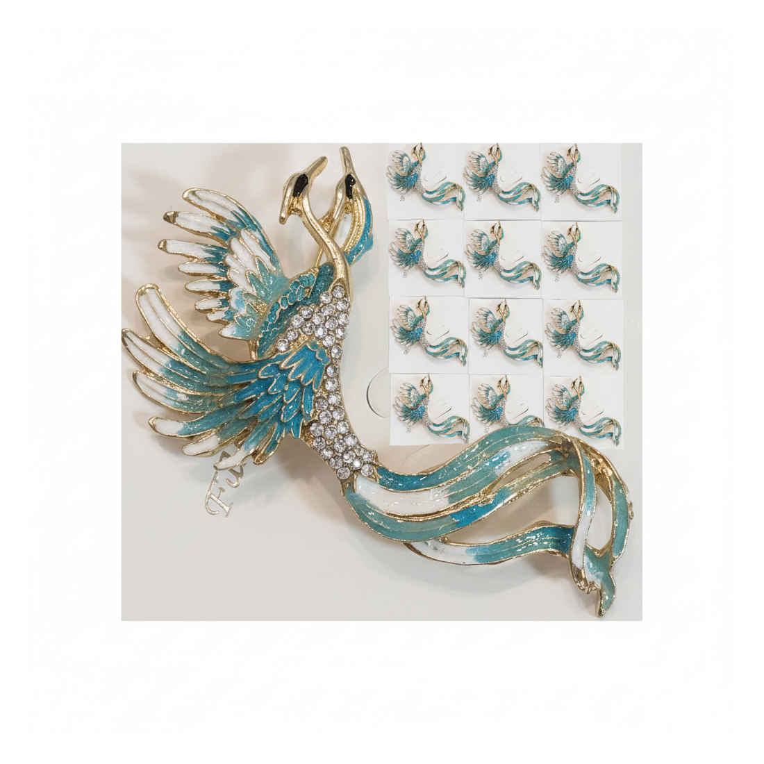 Entdecken Sie diese außergewöhnliche Phönix-Brosche, die mit ihren reichen Details besticht. Die goldene Basis, türkisfarbene und weiße Emaille sowie funkelnde Zirkone schaffen eine faszinierende Komposition. Dieses elegante Schmuckstück verleiht jedem Outfit Glanz, von lässig bis abendlich. Perfekt als raffinierter Akzent für Mantel, Blazer oder Kleid, um Ihren einzigartigen Stil und Ihre Liebe zum Luxus zu unterstreichen.