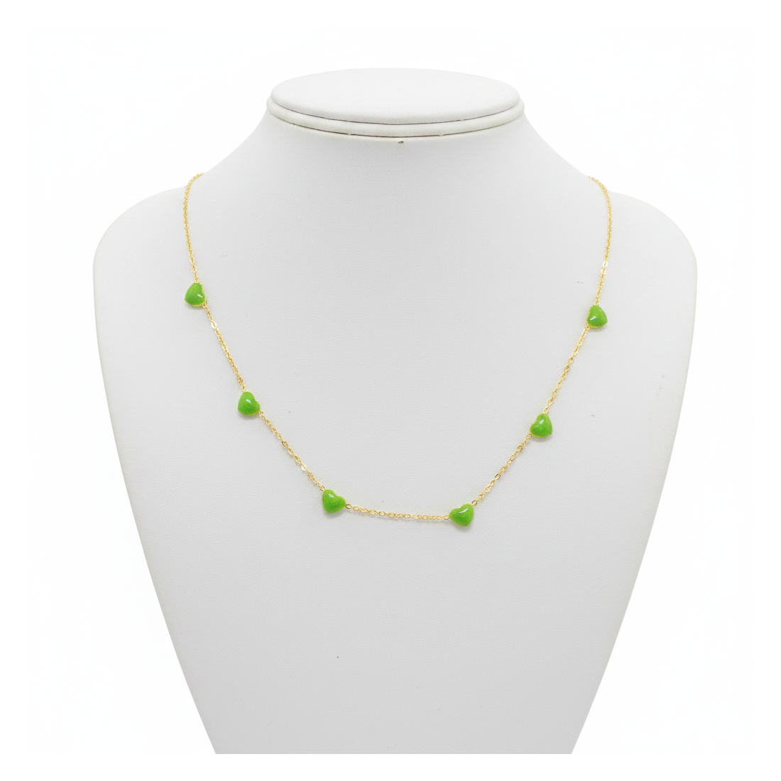 Entdecken Sie den Charme der Halskette Chloe, die mit ihrer Zartheit und Frische besticht. Diese vergoldete Kette ist mit bezaubernden, emaillierten Herzen in einem lebhaften Grünton verziert, die in regelmäßigen Abständen angeordnet sind. Perfekt, um sie solo als subtilen Akzent zu tragen oder mit anderen Halsketten für einen trendigen Lagenlook zu kombinieren. Verleihen Sie Ihren Alltagsoutfits einen Hauch von Farbe und mädchenhafter Anmut oder betonen Sie die Leichtigkeit Ihrer Sommeroutfits. Dieses Schmuckstück wird sicherlich Blicke auf sich ziehen und jeder Frau Glanz verleihen.