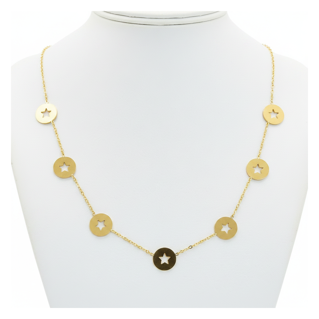 Entdecken Sie den Charme der Sternchen Halskette, die mit ihrem subtilen Glanz und modernen Design besticht. Diese elegante Kette ist mit niedlichen, runden Anhängern mit ausgeschnittenen Sternen verziert, die in regelmäßigen Abständen angeordnet sind. Hergestellt aus vergoldetem Chirurgenstahl, ist sie langlebig und hypoallergen, ideal für den täglichen Gebrauch. Sie ergänzt perfekt sowohl lässige als auch formellere Outfits und verleiht ihnen einen Hauch von Glamour. Eine ideale Wahl für Frauen, die zarten, aber auffälligen Schmuck schätzen.
