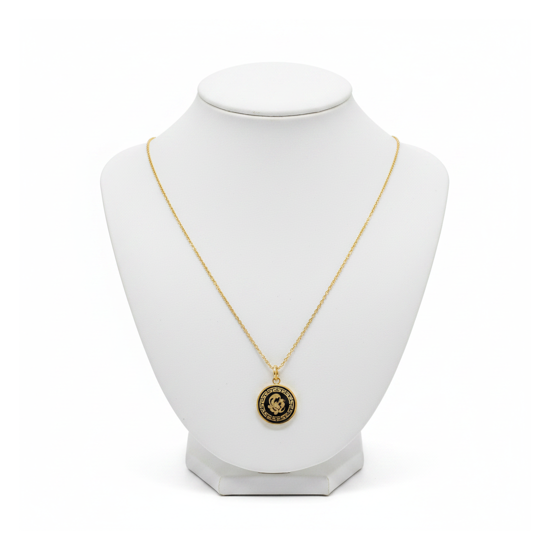 Entdecken Sie die Schönheit der Halskette Aphrodite, die klassische Eleganz mit einem subtilen Hauch von Glamour verbindet. Die zarte, vergoldete Kette harmoniert perfekt mit dem runden Anhänger, der ein charmantes Mutter-Kind-Motiv zeigt, umrahmt von einem griechischen Muster. Dieses Schmuckstück ist ein ideales Accessoire für den Alltag und besondere Anlässe und unterstreicht Ihren einzigartigen Stil. Drücken Sie Ihre Gefühle aus oder verleihen Sie jedem Outfit Glanz.