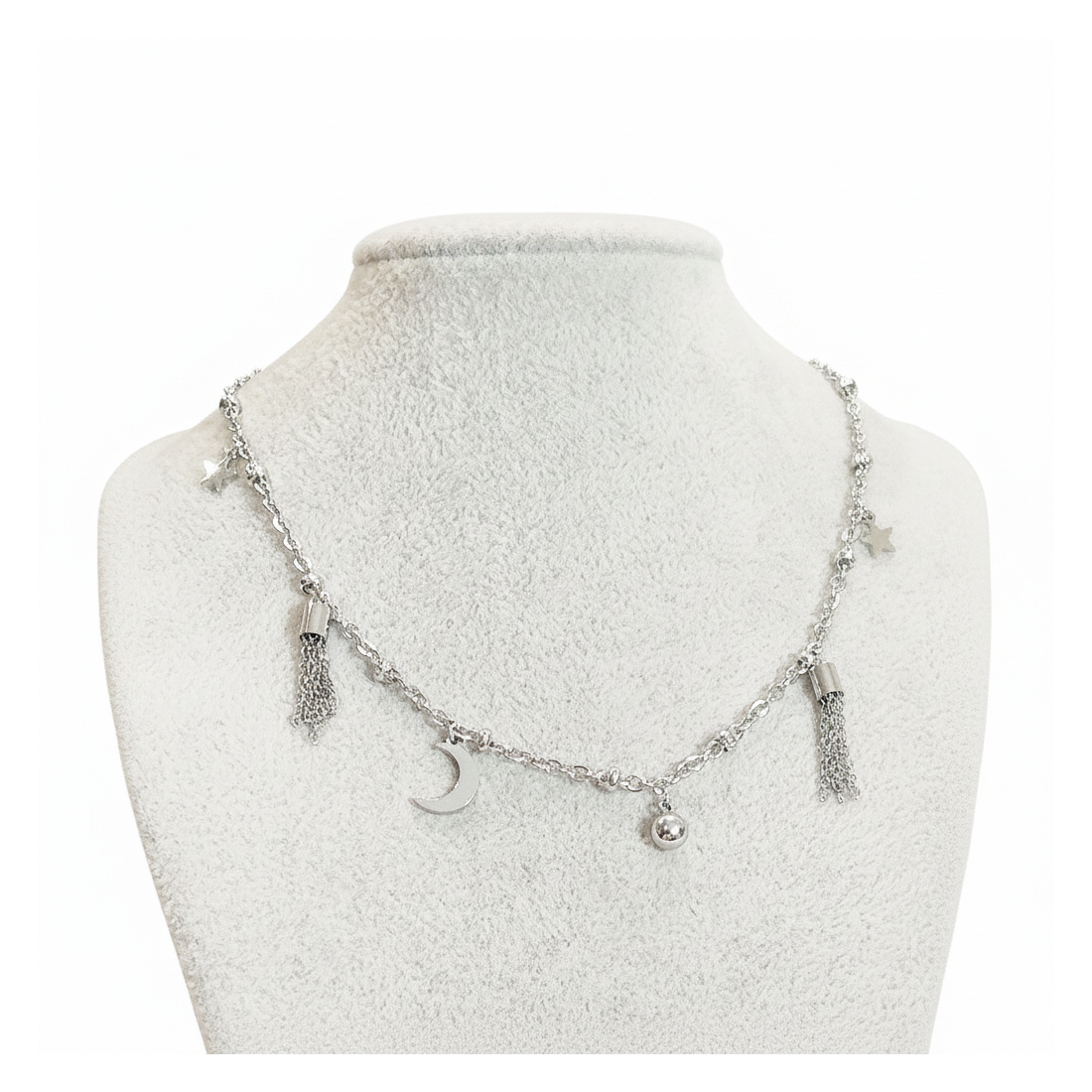 Entdecken Sie den Charme der Luna Halskette, die mit ihrer subtilen Mischung aus himmlischen Motiven und modernem Design besticht. Gefertigt aus robustem Chirurgenstahl, ist sie anlaufbeständig und ideal für empfindliche Haut. Ihre zarte Kette ist mit bezaubernden Anhängern in Form eines Mondes, Sternen und trendigen Quasten verziert. Diese Halskette ist ein perfektes Accessoire, das jedem Outfit, ob lässig oder abendlich, Glanz verleiht und Ihren individuellen Stil unterstreicht.