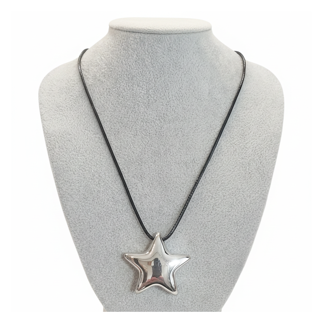 Lassen Sie sich von unserer Halskette mit einem großen, schimmernden Stern verzaubern, der mit seinem silbrigen Glanz alle Blicke auf sich zieht. Dieser einzigartige Anhänger hängt an einem eleganten schwarzen Band und schafft eine harmonische Mischung aus Modernität und einem Hauch von Glamour. Perfekt für den Alltag und besondere Anlässe, verleiht er jedem Outfit Charakter. Betonen Sie Ihre Individualität und verleihen Sie Ihrem Look mit diesem modischen Accessoire von Marsandia Glanz.