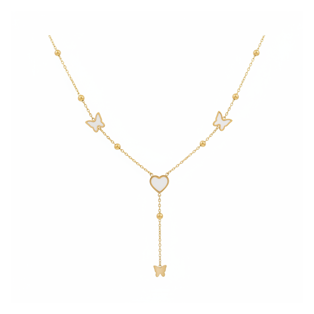 Entdecken Sie Charme und Leichtigkeit mit unserer vergoldeten Halskette, die durch ihre subtile Kombination aus Schmetterlingen und einem Herz besticht. Die zarte Kette ist mit kleinen Perlen und weißen Perlmutt-Anhängern verziert, die dem Schmuck einen einzigartigen Glanz verleihen. Das zentrale Perlmutt-Herz harmoniert perfekt mit zwei symmetrisch auf der Kette platzierten Schmetterlingen. Zusätzlich baumelt ein charmanter Schmetterling vom Herzen herab und erzeugt einen trendigen Lariat-Effekt. Diese Halskette ist die ideale Wahl für Frauen, die einen romantischen und femininen Stil schätzen und sowohl Alltags- als auch Abendoutfits perfekt ergänzt.