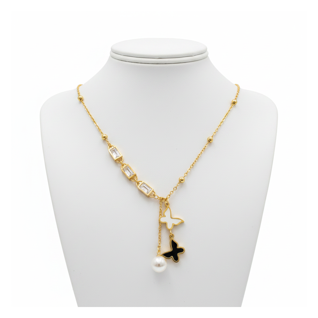 Entdecken Sie den Charme dieser Halskette, die Zartheit mit modernem Stil verbindet. Die goldene Kette ist mit schimmernden Zirkonia in rechteckigen Fassungen verziert und schafft eine elegante Komposition. Zwei bezaubernde Schmetterlinge, einer weiß und einer schwarz, verleihen dem Schmuckstück Leichtigkeit und Originalität. Abgerundet wird das Ganze durch eine zarte Perle, die das Licht wunderschön reflektiert. Diese Halskette ist eine ideale Wahl für besondere Anlässe sowie für elegante Alltagsoutfits und unterstreicht Ihren einzigartigen Geschmack.
