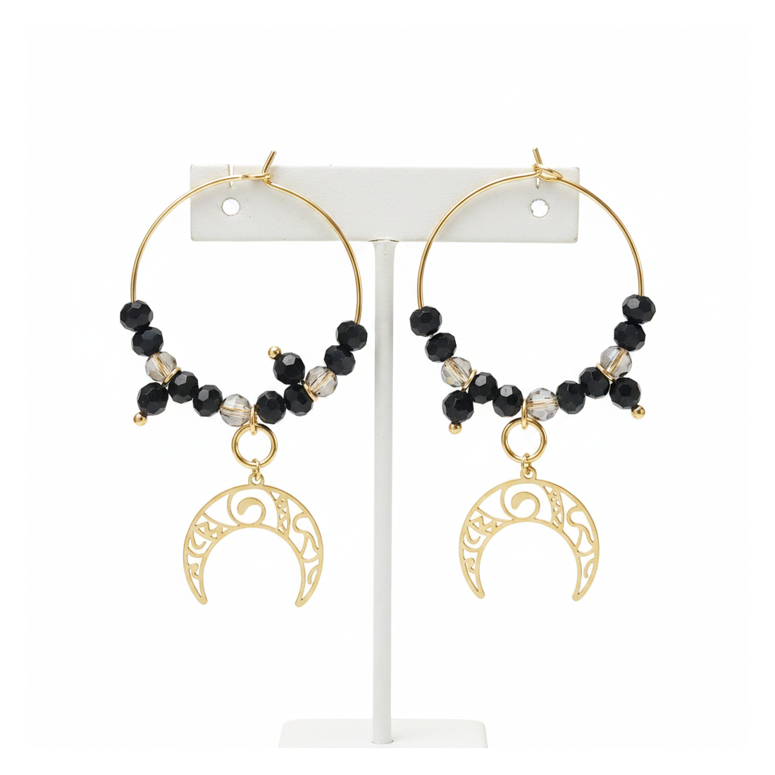 Diese bezaubernden Creolen sind die Essenz des Boho-Stils mit einem Hauch von Glamour. Goldene Reifen sind mit facettierten schwarzen und grauen Perlen verziert, die das Licht wunderschön reflektieren. Das Design wird durch filigrane, durchbrochene Mondanhänger ergänzt, die dem Schmuck einen geheimnisvollen Reiz verleihen. Perfekt für Abendveranstaltungen, Festivals oder als markantes Accessoire für den Alltag. Betonen Sie Ihren individuellen Stil mit diesen einzigartigen Ohrringen.