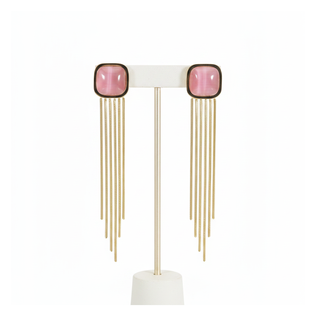 Entdecken Sie die Ohrringe Cindy, die mit ihrer Mischung aus klassischer Eleganz und modernem Glamour bestechen. Ein quadratischer rosa Kunststein, gefasst in einer goldfarbenen Legierung, kontrastiert wunderschön mit einer Kaskade zarter, goldener Ketten. Diese Hängeohrringe verleihen jedem Outfit Glanz und passen perfekt zu eleganten Ensembles sowie zu lässigeren Looks. Betonen Sie Ihren Stil und fühlen Sie sich außergewöhnlich mit diesem einzigartigen Schmuckstück.
