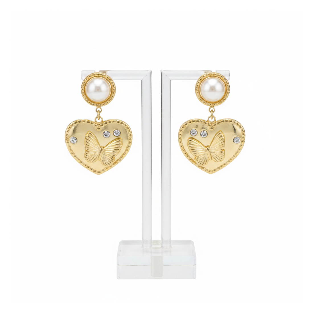 Entdecken Sie den Charme dieser Hängeohrringe, die klassische Eleganz mit einem romantischen Akzent verbinden. Der obere Teil besteht aus einer zarten synthetischen Perle, darunter hängt ein Herz, verziert mit einem filigranen Schmetterling und funkelnden Zirkonia. Ideal für Abendgarderobe, verleihen sie jedem Outfit Glanz und Raffinesse. Betonen Sie Ihren Stil mit diesen einzigartigen Ohrringen.