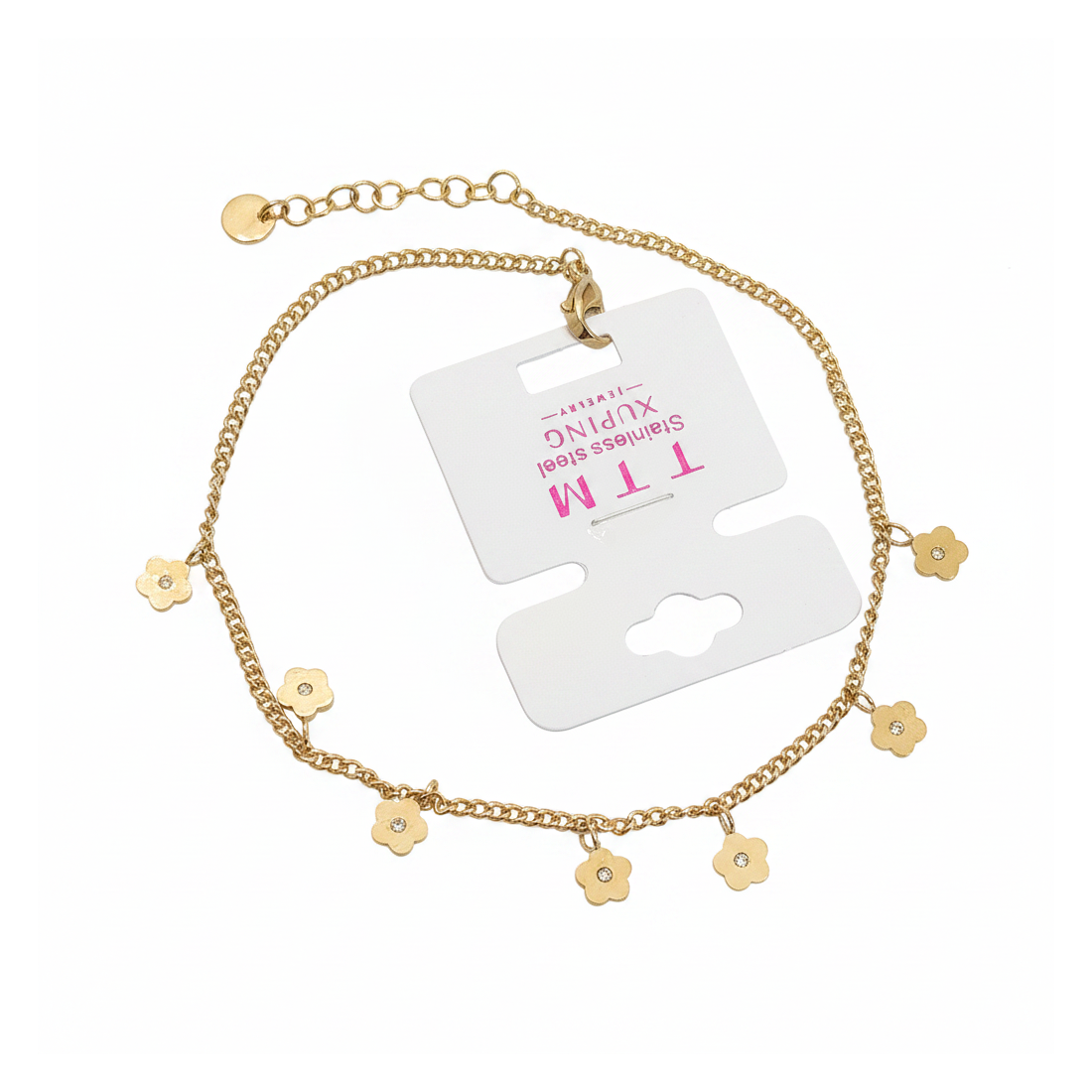 Discover the charm of delicacy with our gold-colored anklet, adorned with lovely, tiny flower charms. Crafted from high-quality stainless steel, it guarantees durability and comfortable wear without allergy concerns. Each flower features a subtle cubic zirconia, adding sparkle and elegance to the jewelry. Ideal for summer days, holidays, or as a stylish accent to both casual and evening outfits. Enhance your style with this beautiful, feminine accessory.