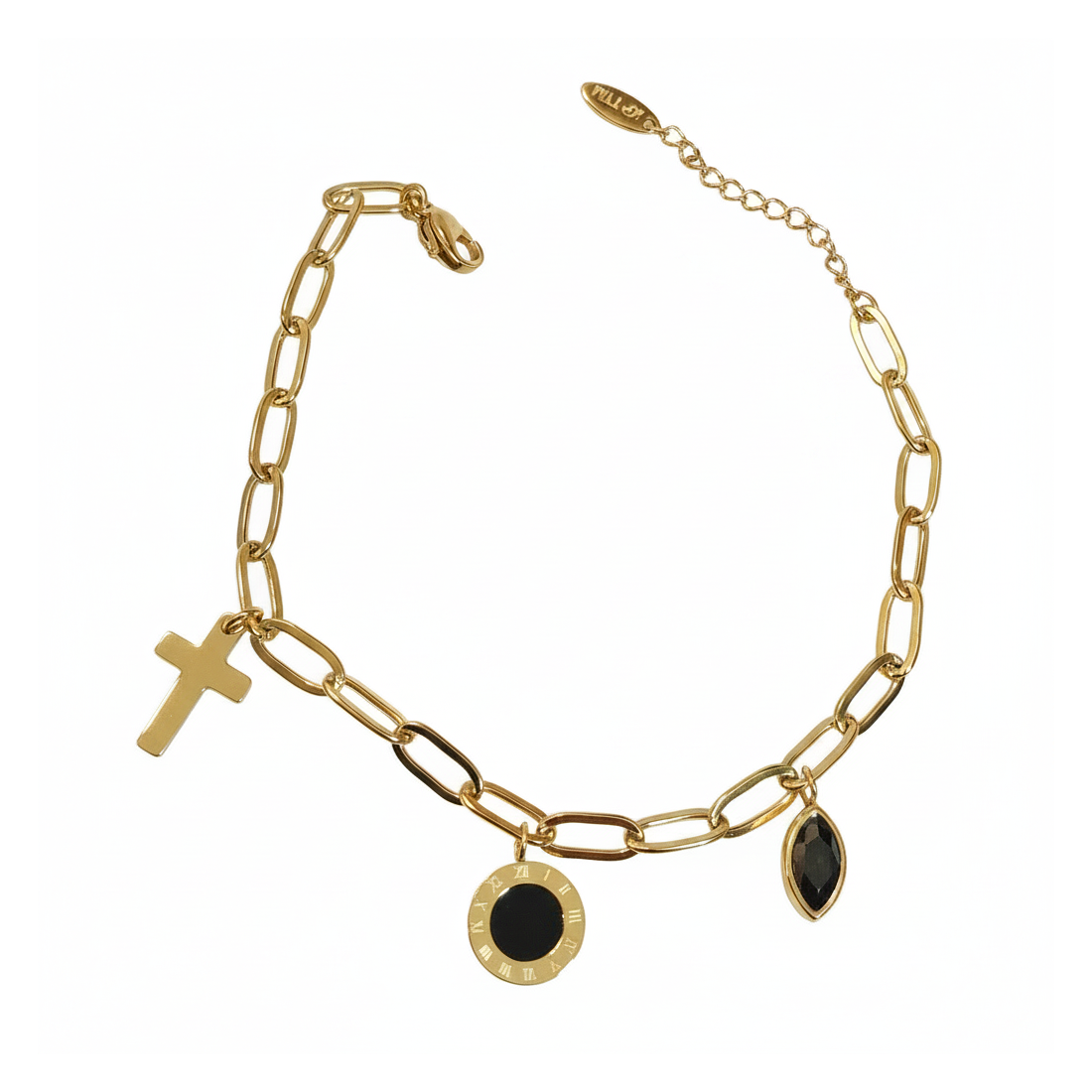 Discover the Carmen bracelet, blending modern design with classic accents. The gold chain, featuring a unique link pattern, is adorned with three distinctive charms: a subtle cross, a round element with Roman numerals and black infill, and an elegant marquise-shaped black stone. This is the perfect accessory to enhance your style, adding sparkle and sophistication. Ideal for everyday wear and special occasions.
