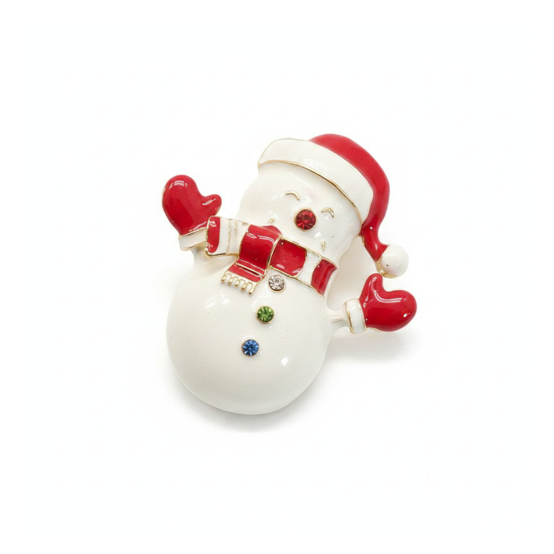Discover our charming snowman brooch, designed to brighten up any winter ensemble. Crafted from enameled metal alloy, it features sparkling, colorful zircons that mimic buttons and a cheerful smile. The snowman is adorned with a festive red hat and scarf, enhancing its holiday spirit. This brooch is an ideal accessory for a coat, sweater, or scarf, bringing a touch of magic to your look. Express your unique style and embrace winter fashion with a hint of glamour.