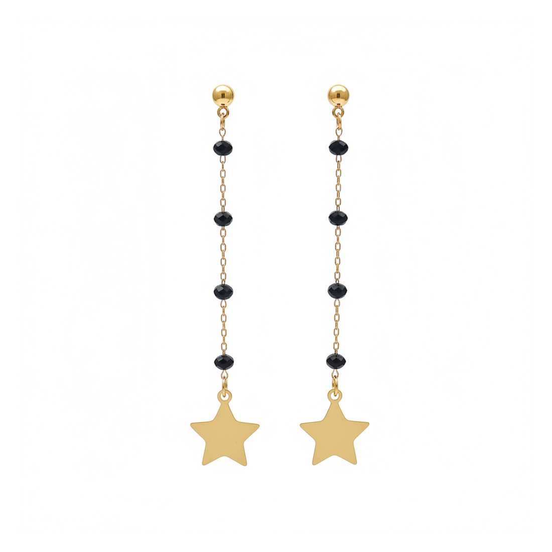 Discover the sparkle with Stella Star Dangle Earrings, adding unique charm to your outfit. Crafted from gold-toned stainless steel, they are adorned with elegant black beads and charming stars. Their dangling design beautifully elongates the neck, while the minimalist yet glamorous style is perfect for both everyday wear and special occasions. Accentuate your style with these fashionable and durable earrings.