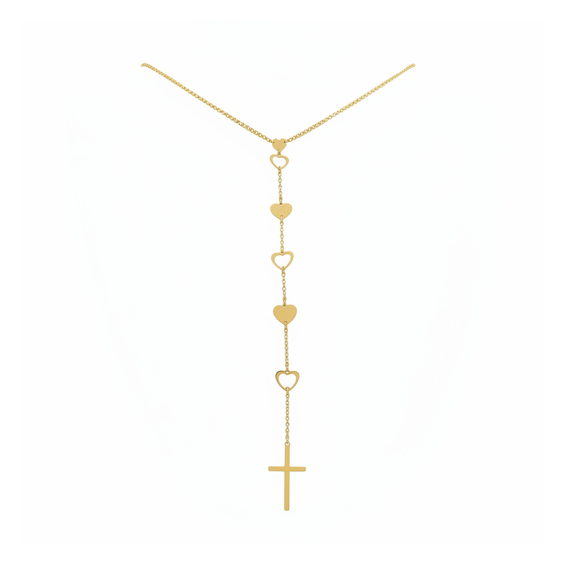 Discover charm and symbolism with our gold Y-shaped necklace, combining the delicacy of hearts with the power of a cross. Made from durable surgical steel, it captivates with its shine and precise craftsmanship. Perfect for wearing solo as a subtle accent or layered for added depth. This unique accessory is ideal for everyday wear and special occasions, emphasizing your individual style. It's jewelry that tells a story and adds sparkle.
