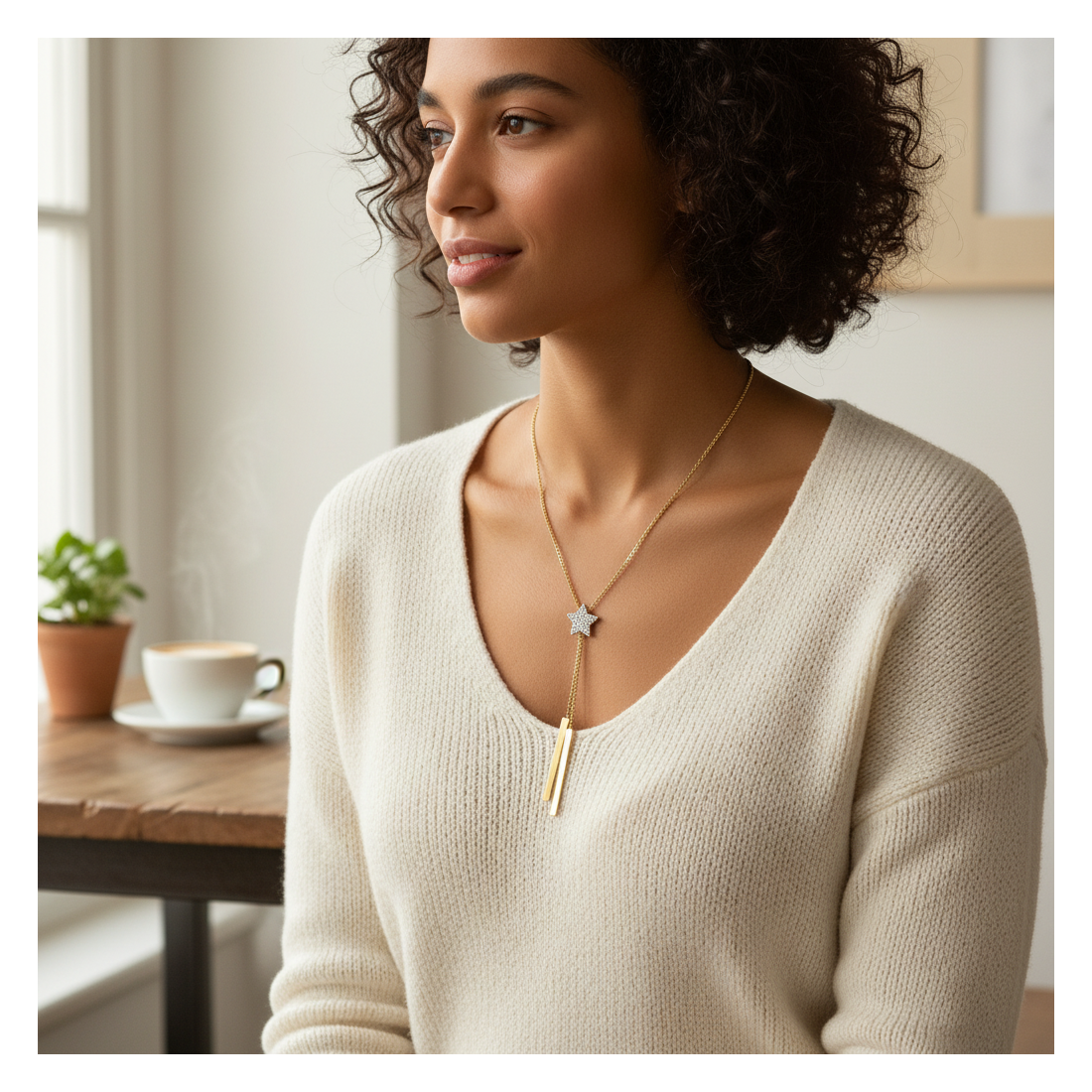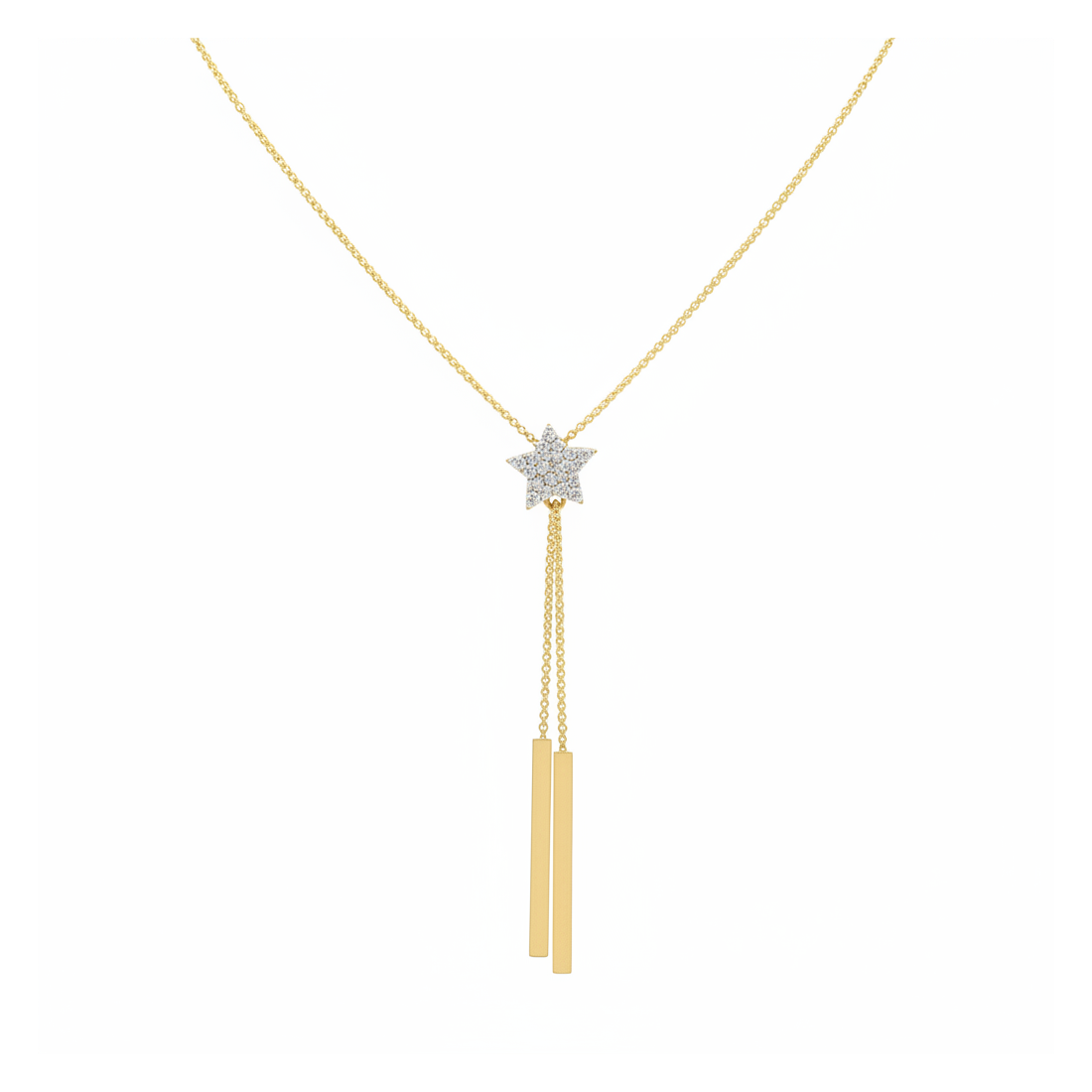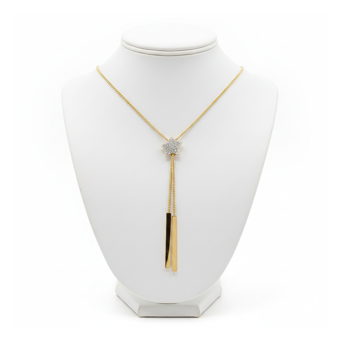 Discover the charm of the Stella Lariat Necklace, captivating with its modern design and subtle sparkle. Crafted from high-quality gold-plated metal alloy, it features a central star densely set with shimmering cubic zirconia. Two elegant, straight pendants add a unique character, perfectly accentuating the décolletage. This necklace is an excellent choice for evening outings, dates, or special occasions, adding a touch of glamour and sophistication to any outfit.