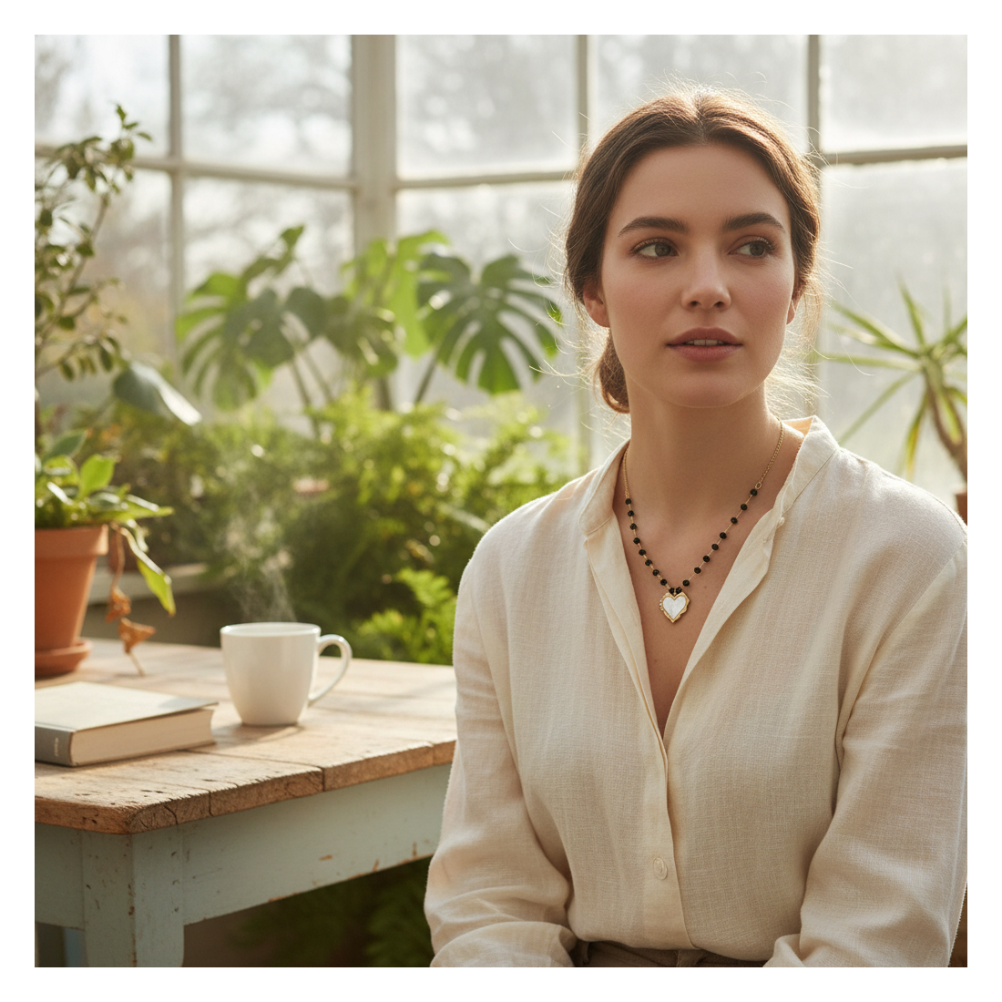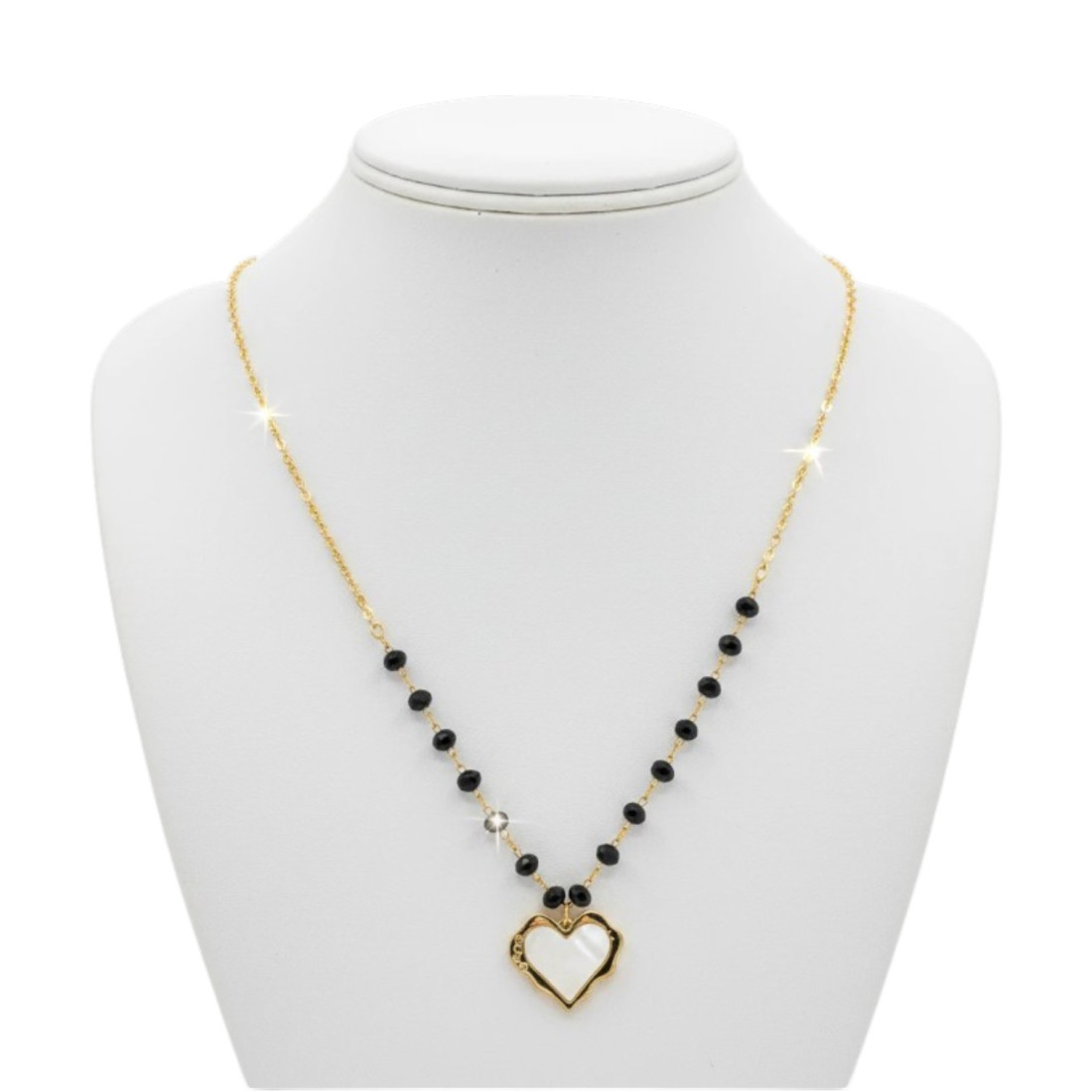 Be enchanted by the delicate Heart Aura necklace, blending classic elegance with modern sparkle. A golden chain, adorned with faceted black beads, leads to a charming heart-shaped pendant. The white mother-of-pearl imitation, framed by a golden outline with subtle zircons, adds a unique touch. This is the perfect accessory to highlight your elegance and add a romantic accent to any outfit, from everyday wear to evening attire.