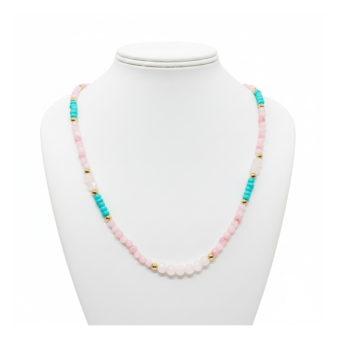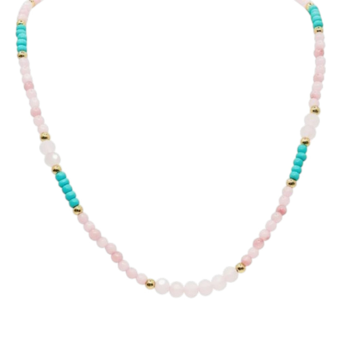 Discover the charm of the Aura necklace, combining the delicacy of rose quartz with an exotic touch of turquoise. This lovely accessory, enriched with subtle gold beads, will perfectly highlight your natural beauty and add sparkle to any outfit. Perfect for everyday wear or special occasions, it will bring a breath of freshness and lightness to your wardrobe. Wear it solo or layered with others to create a unique, multi-dimensional look. It's an ideal choice for women who appreciate boho elegance and natural beauty.