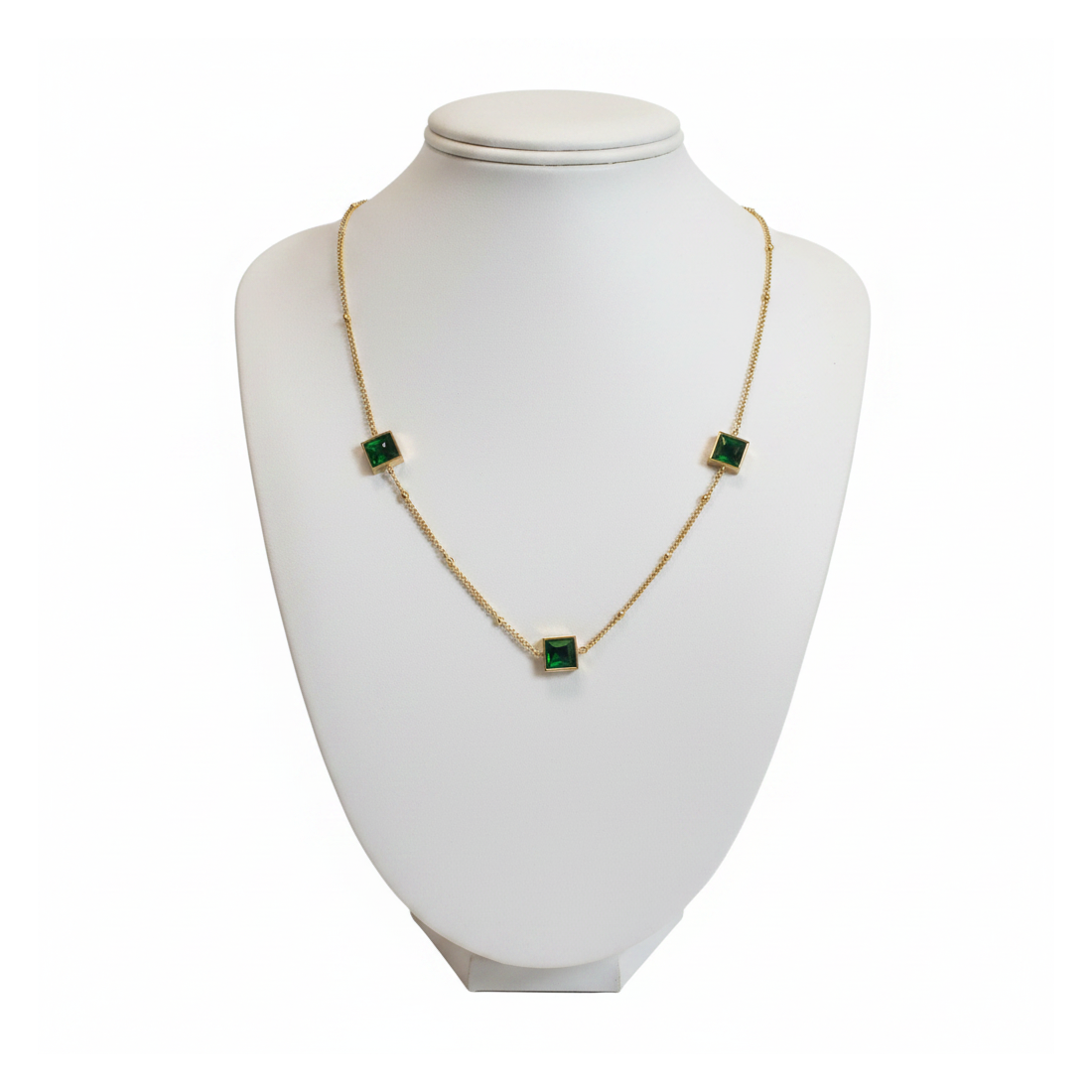 This charming necklace is the epitome of subtle glamour, perfect for both everyday wear and special occasions. A delicate gold-plated chain is adorned with three square, emerald-green cubic zirconia stones that beautifully catch the light. Its minimalist yet elegant design makes it a versatile piece, complementing both casual and evening attire. Add a touch of luxury to your jewelry collection with this exquisite model.