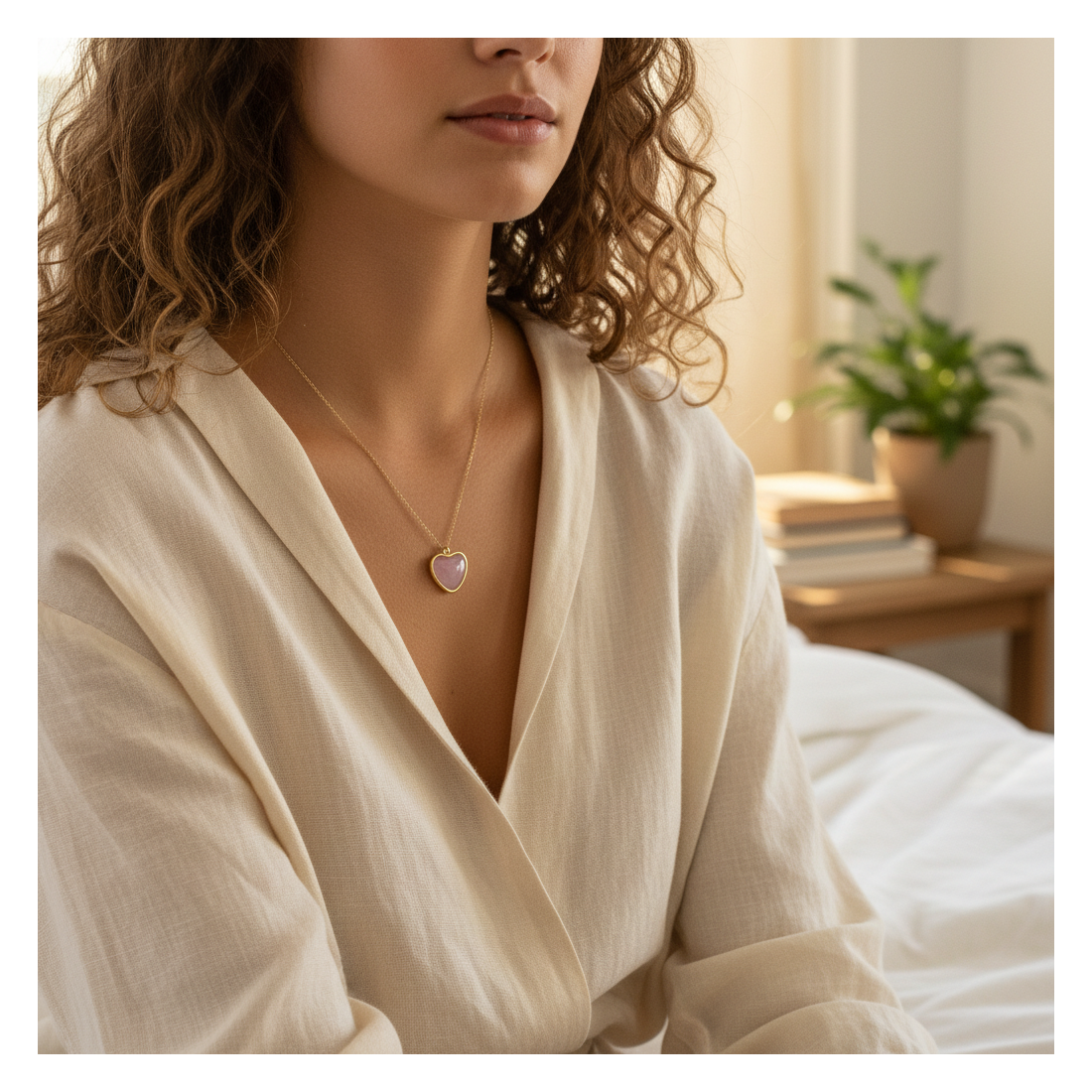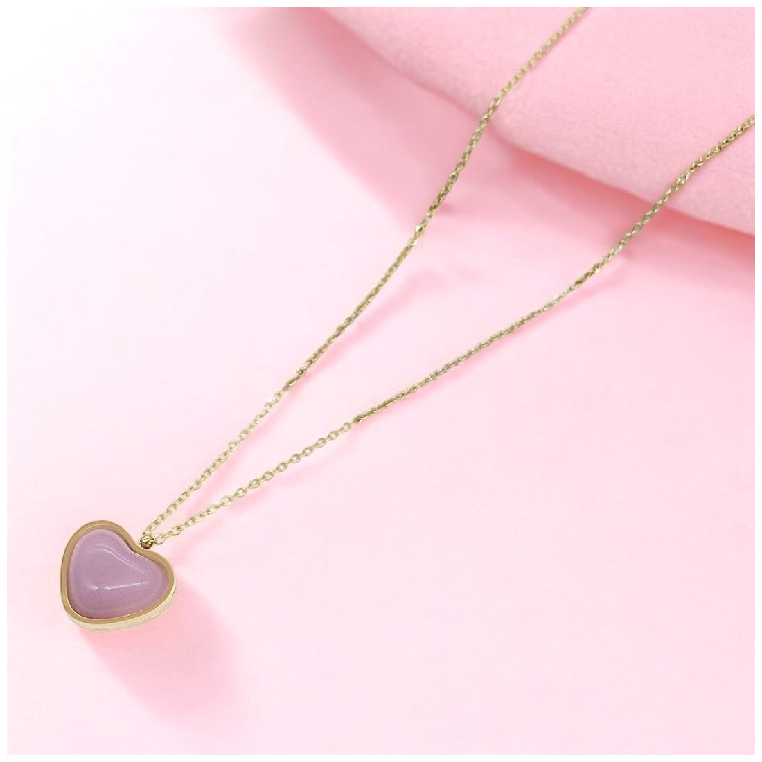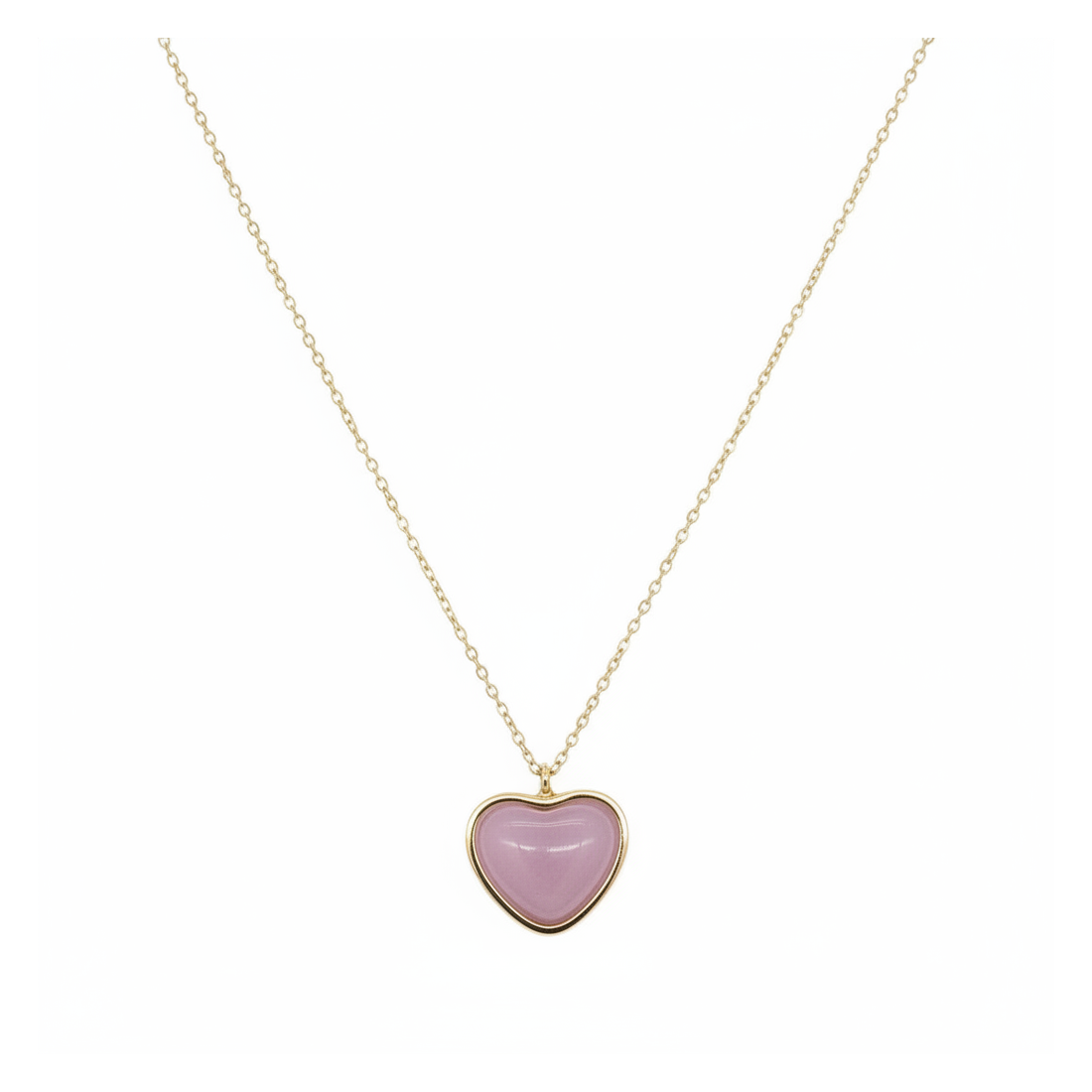 Be enchanted by the subtle beauty of the Aura Heart Necklace, combining classic elegance with a touch of romance. The delicate, gold-plated chain perfectly complements the charming heart-shaped pendant, filled with a smooth, pink natural stone. This unique accessory will enhance your style, adding sparkle to both everyday and evening creations. Ideal as a gift, it symbolizes love and tenderness, while being a fashionable accent.