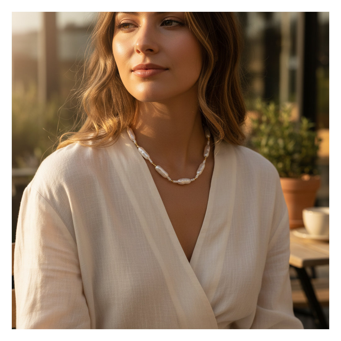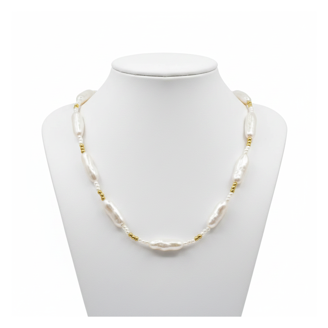 Discover the charm of the Bianca Pearl Necklace, blending classic elegance with a modern touch. Irregular baroque pearls, interspersed with delicate golden beads, create a unique composition. This necklace will perfectly complement both everyday and evening outfits, adding a subtle glow. Ideal as a gift or a unique addition to your collection.