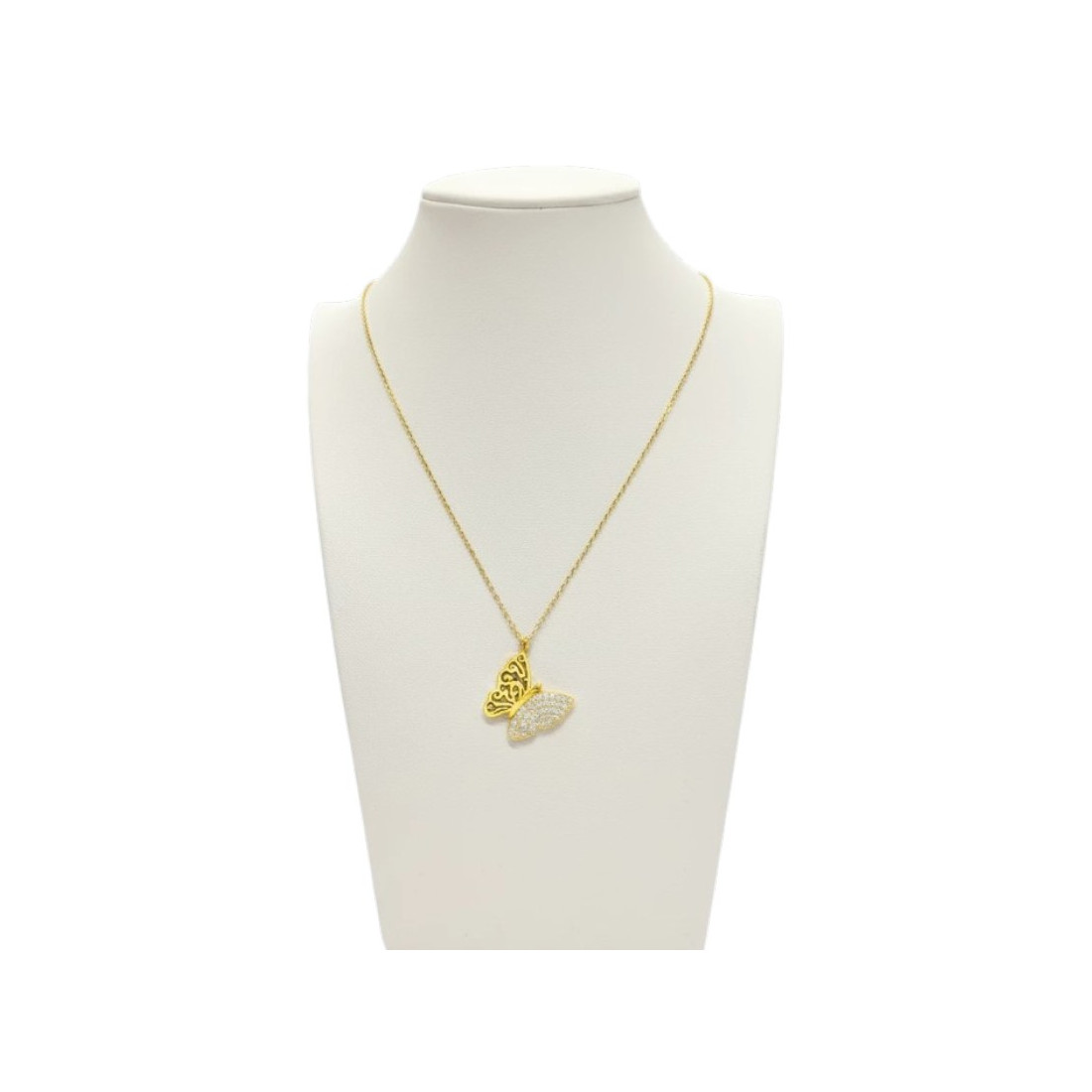 Captivating necklace featuring a delicate butterfly, symbolizing lightness and transformation. One wing of the butterfly is adorned with shimmering zircons, while the other boasts an intricate openwork design, creating a unique contrast. This gold-colored jewelry perfectly enhances your elegance and adds sparkle to both everyday and evening looks. An ideal choice for women who appreciate subtle glamour and original details.