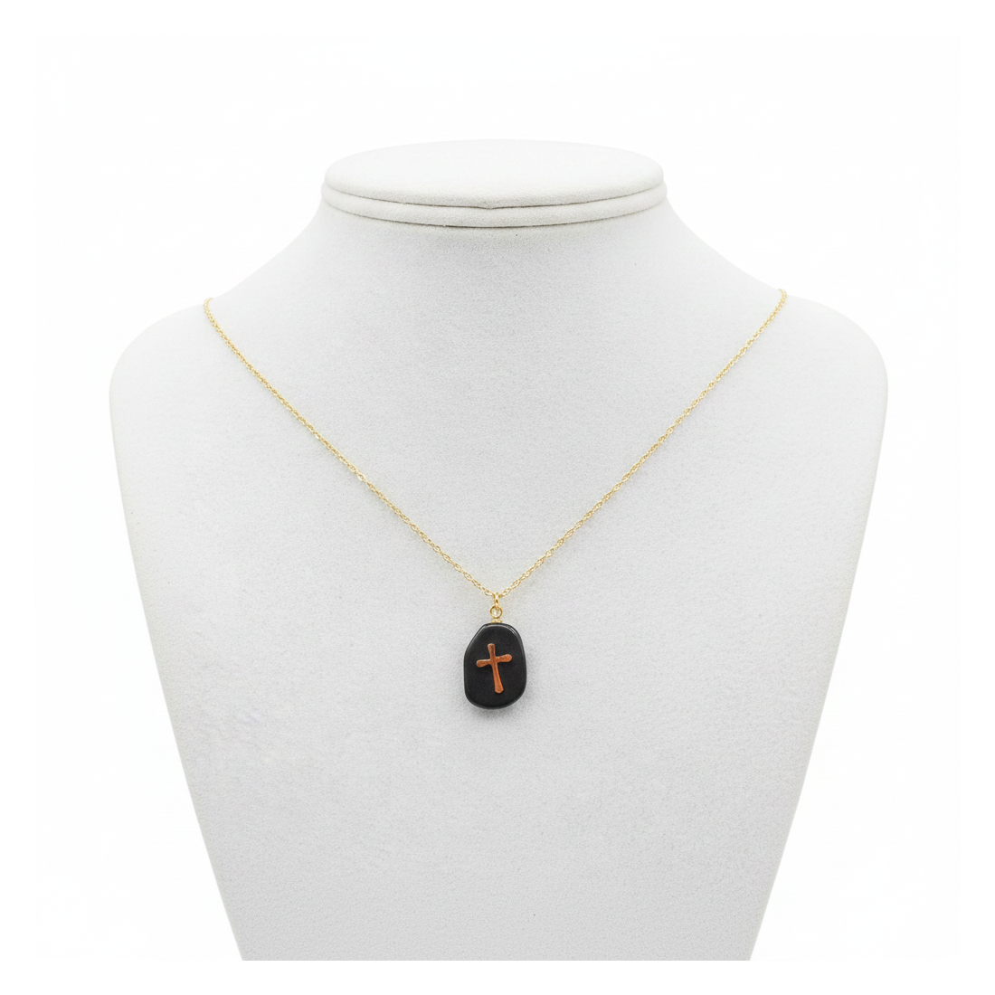 Discover the subtle charm of this necklace with a delicate gold-colored chain. Its focal point is an elegant, irregularly shaped black pendant, adorned with a copper-toned cross. This classic accessory will perfectly highlight your style, adding a touch of spirituality and elegance. Ideal for daily wear or as a unique accent to an evening outfit.