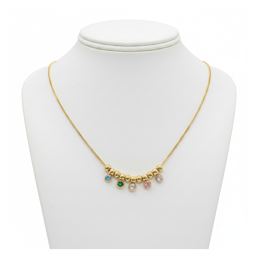 Discover the charm of the Cindy necklace, captivating with its subtle glow and joyful colors. This delicate golden chain is adorned with charming beads and five shimmering cubic zirconia stones in shades of blue, green, and pink. Perfect for everyday wear to add lightness and elegance to your outfit, and also great as an accent for special occasions. Made of surgical steel, it guarantees durability and wearing comfort.