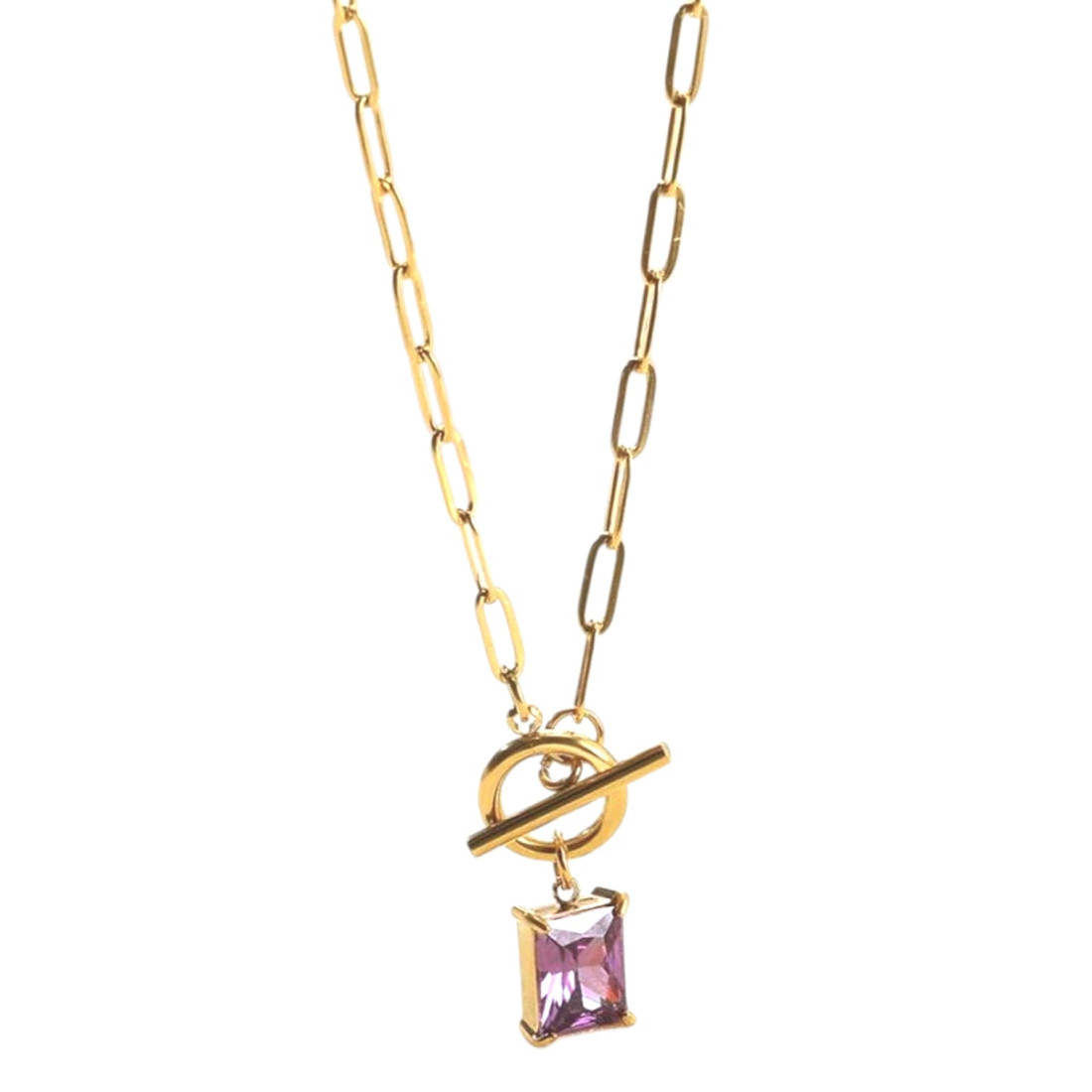 Discover the charm of the Viola necklace, blending modern design with a touch of classic elegance. Crafted from durable, gold-plated surgical steel, it features a trendy paperclip chain and a stylish toggle clasp. The centerpiece is a beautifully cut purple cubic zirconia, adding sparkle and color. Ideal for everyday wear and special occasions, it will highlight your individual style.