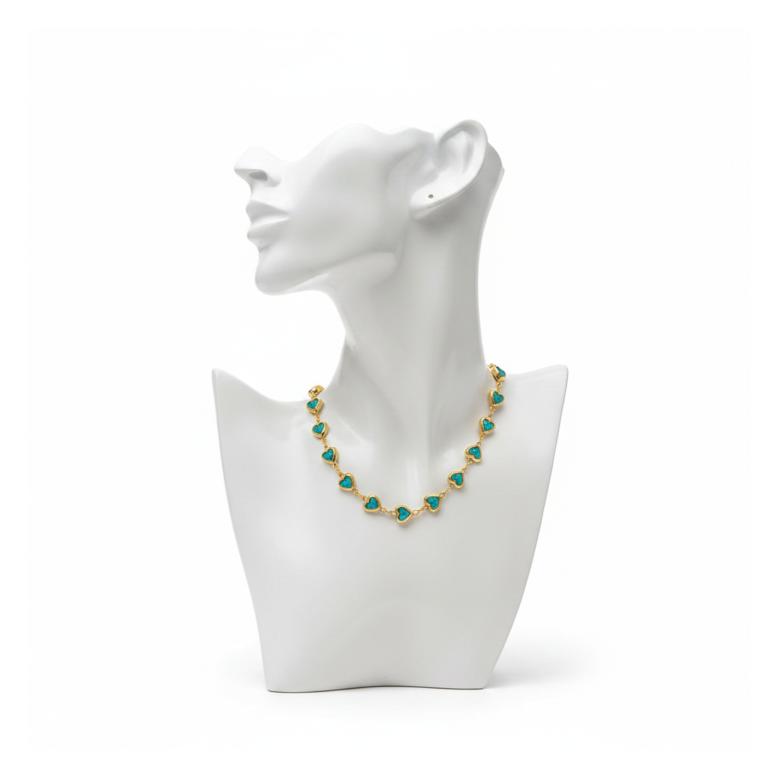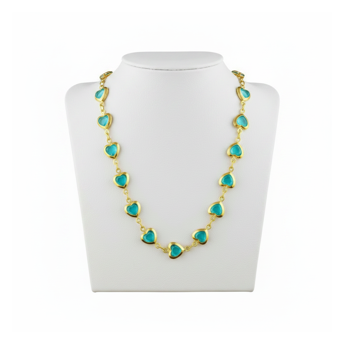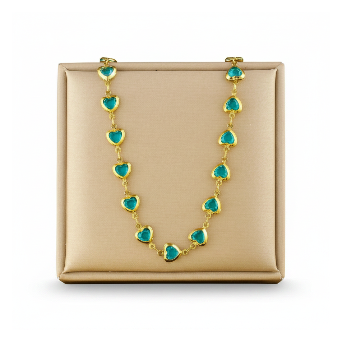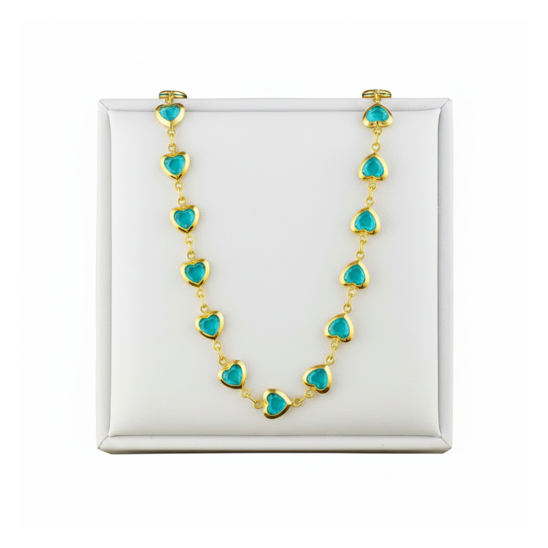 This charming necklace is the epitome of delicacy and romance. The golden chain is adorned with a series of shimmering, turquoise hearts that beautifully reflect light. Perfect for everyday wear or special occasions, it will add sparkle to any outfit. Emphasize your individual style and feel special with this subtle piece of jewelry. An excellent gift idea for a loved one.